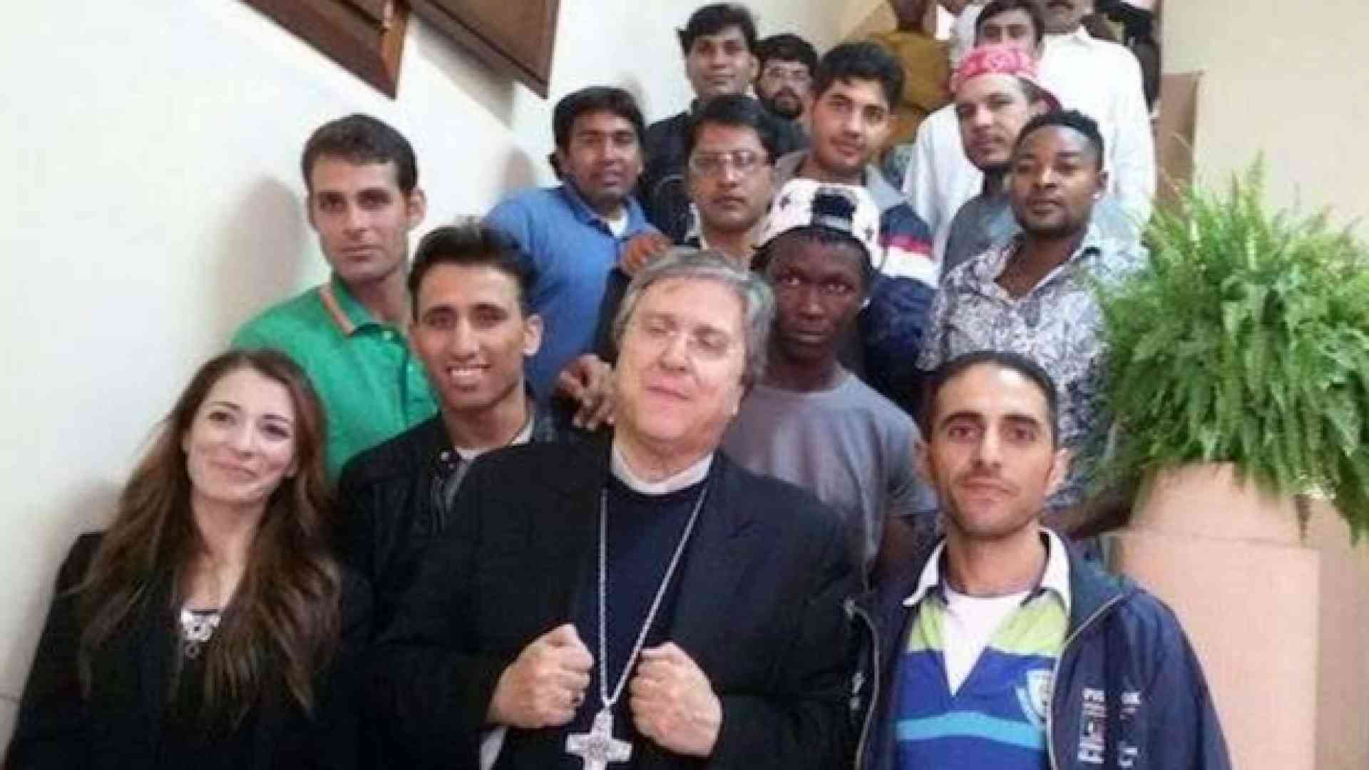 Il vescovo Savino tra i migranti, sotto a destra con un gruppo di fedeli, più in basso mentre parla ai giovani.