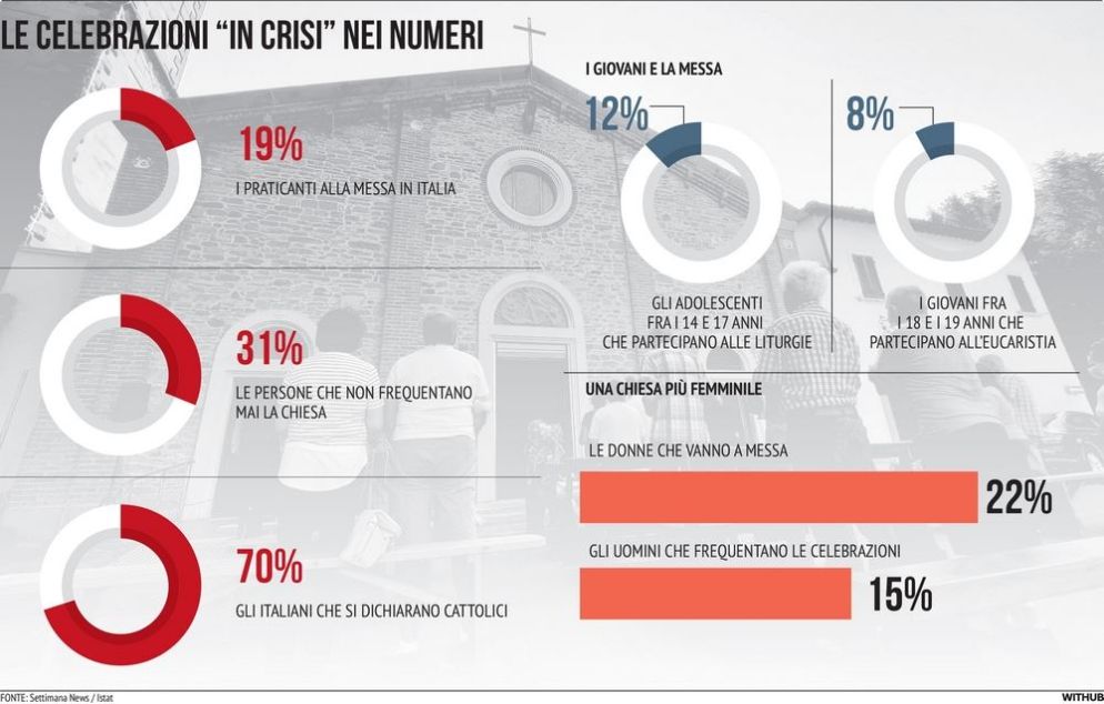 Il campanile non chiama più come accadeva fino a pochi anni fa. Invece di un popolo intorno alla mensa eucaristica, c’è un “gregge disperso” che frequenta sempre meno le Messe nelle parrocchie italiane. E qualcuno parla di «chiese vuote». Sintesi semplicistica, a dire il vero, per raccontare il calo della partecipazione alle celebrazioni. Come ha mostrato di recente la testata online dei dehoniani Settimana News.it. Chi prende parte a un rito religioso almeno una volta alla settimana è circa il 19% della popolazione. Una cifra che si è ridotta di un terzo in diciotto anni. «È evidente la diminuzione della pratica della fede. Ma occorre ricordare che l’esperienza ecclesiale non si esaurisce entro i confini del rito. Come narra il Vangelo, Cristo è passato beneficando e risanando tutti quelli che incontrava nei contesti ordinari della vita. Ecco, la Chiesa intercetta non soltanto coloro che si siedono sulle panche ma l’intero popolo di Dio che comprende anche chi si interroga sulla verità e sul bene. Del resto non dobbiamo disconoscere che c’è una diffusa ricerca di spiritualità nel nostro Paese, di cui la Chiesa è chiamata a farsi interprete», spiega il vescovo di Mantova, Gianmarco Busca, presidente della Commissione episcopale Cei per la liturgia. E subito propone una domanda: «Dovremmo chiederci: chi si è allontanato da chi? È la gente che si è allontanata dalla Chiesa o da determinate ritualità; oppure è la Chiesa che si è allontanata dalle persone perdendo in parte la sua capacità di incontro nel nome del Vangelo? Comunque spesso siamo di fronte a comunità con legami fragili, con appartenenze deboli e talvolta anche con uno stile di fraternità a velocità variabile».