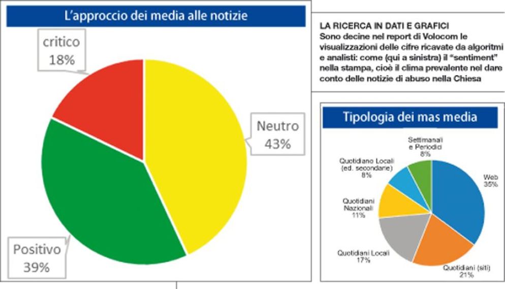 Qual è il quotidiano italiano che ha dato più spazio e rilievo al dramma degli abusi sui minori nella Chiesa? È Avvenire, «insospettabilmente». L’avverbio, che tradisce la più viva sorpresa, sintetizza alla perfezione l’esito del meticoloso report «Chiesa e abusi sui minori nei media italiani», 100 pagine di dati e tabelle consegnate ai media nei giorni scorsi da Volocom, società leader nel campo della «news intelligence analysis», ovvero l’esame dell’imponente mole di notizie prodotte ogni giorno dal sistema informativo italiano, setacciata e catalogata.