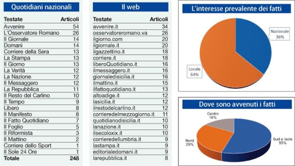 Ma gli oltre duemila articoli setacciati dagli analisti dicono anche altro, perché la quantità di uscite va combinata con la provenienza della notizia e del giornale che la riferisce (nazionale o locale), il tipo di racconto (cronaca o analisi), la collocazione in pagina, il clima prevalente nei confronti della Chiesa (critico o fiducioso): ingredienti che nel loro insieme offrono un dato qualitativo per il quale l’algoritmo non basta più e occorre la valutazione degli analisti. Il report registra come «siano soprattutto fatti avvenuti nel territorio locale (seppur di rilevanza nazionale) a trovare spazio nelle testate giornalistiche»: infatti «sono di più gli articoli che informano e aggiornano su arresti e fasi dei processi di casi avvenuti sul territorio piuttosto che articoli che affrontano il tema in senso generico e a carattere nazionale » (con un rapporto di 64 a 36).