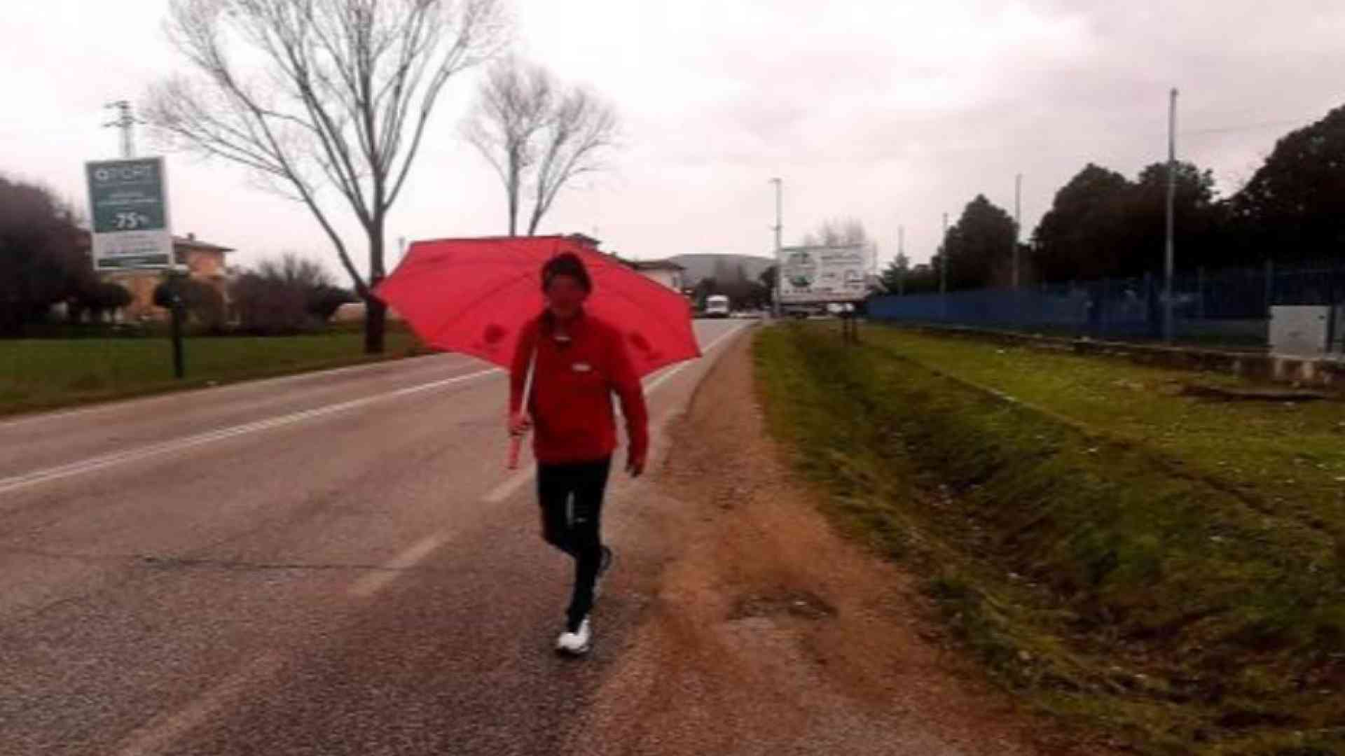 Nonostante la pioggia, Ulderico cammina come un treno. Anche quando era partito per Pechino, a piedi, gli organizzatori erano stati costretti a cambiare il programma, perché andava troppo veloce. Così adesso, partito da Loreto verso Lourdes, il cronoprogramma lo prevedeva lungo la Maremma, e invece è già in Liguria, al Santuario Nostra Signora di Soviore, patrona della diocesi della Spezia-Sarzana-Brugnato. Ulderico Lambertucci, 78 anni, aveva già dato prova di sè nel 2006, correndo a 60 anni 12mila chilometri tra Macerata e Pechino in sei mesi esatti, per pregare sulla tomba del missionario suo concittadino, il venerabile padre Matteo Ricci (1552-1610). Sempre di corsa, tra il 2002 e il 2008, aveva toccato i santuari di Lourdes, Santiago de Compostela, Fatima, Czestochowa, arrivando fino in Terra Santa, unendo insieme devozione religiosa e passione sportiva. Poi, nel 2012, la «coast-to-coast», partendo simbolicamente dalla “replica” della Porziuncola di San Francisco per concludere il suo itinerario a New York, sul memoriale di Ground Zero.