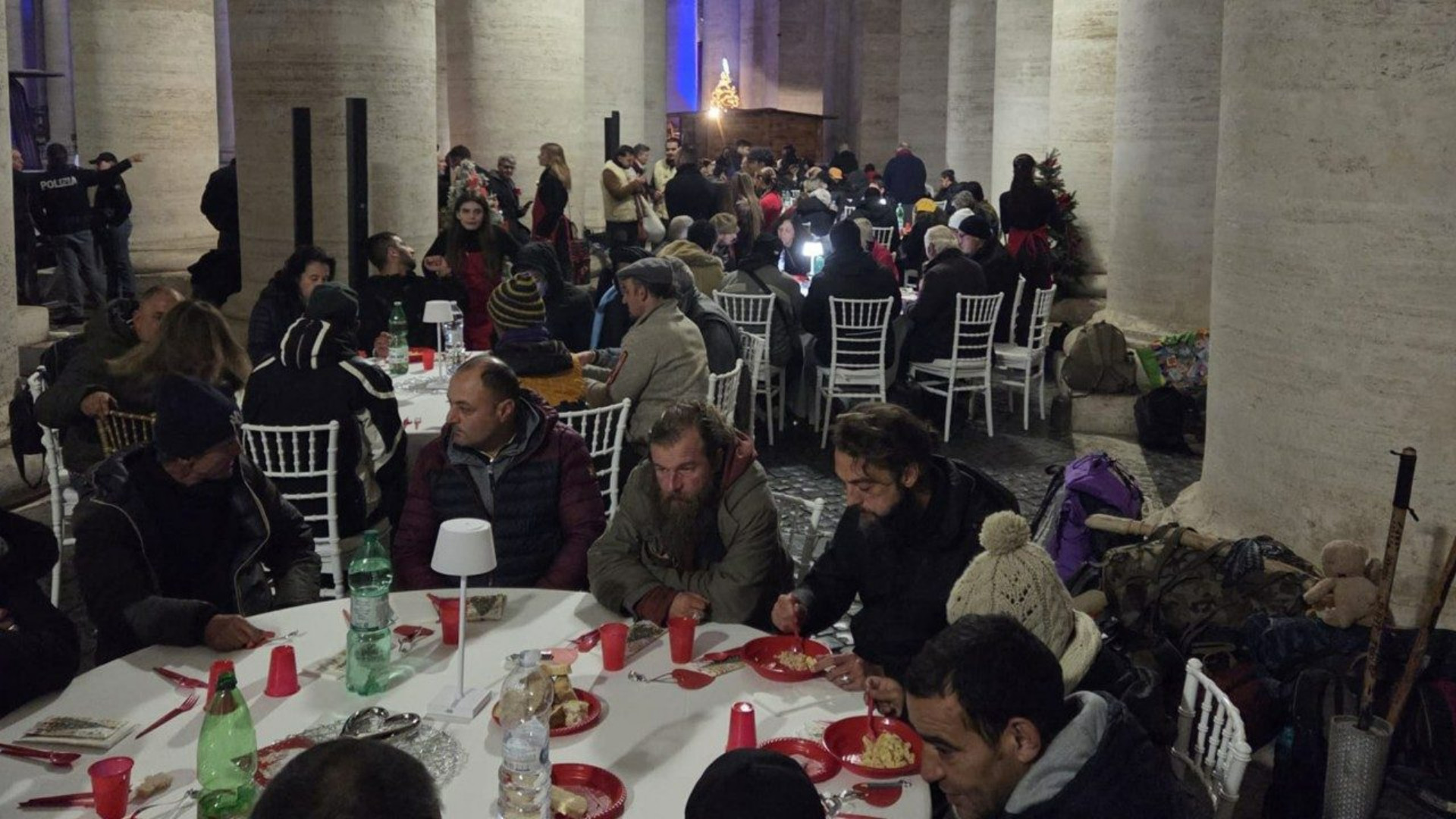 In questo tempo che precede il Natale, piazza San Pietro diventa un luogo animato dallo spirito dell'attesa della natività e si apre a iniziative che superano le semplicità ritualità liturgiche del periodo. Appuntamenti culturali e sociali, caritativi, trovano nelle due braccia che racchiudono la piazza, il loro contesto naturale: nel cuore mondiale della Chiesa il Vangelo prende forma in tutte le forme possibili, con la preghiera, certamente, ma anche con la cultura, il confronto e la fraternità concreta nei confronti di chi vive ai margini. Simbolicamente è proprio ai "margini" della piazza, sotto al colonnato del Bernini, che tutto prende vita, in una specie di rimando a specchio verso l'albero e il presepe al centro del selciato (che saranno inaugurati lunedì prossimo alle 17). Domenica sera, in particolare, un momento particolare, riscaldato dalla spiritualità avventizia e natalizia, ha preso forma proprio nel colonnato, dove 120 persone che si trovano in difficoltà per diversi motivi (per lo più poveri che vivono nei pressi di San Pietro), si sono ritrovate per una cena organizzata dalla parrocchia di San Pietro insieme, assieme all'Elemosineria apostolica, grazie al supporto del Governatorato della Città del Vaticano e del Dicastero per la comunicazione. Si è trattato, insomma, come riporta Vatican News, di «un impegno corale», secondo le parole di fra Agnello Stoia, frate minore conventuale e parroco della Basilica di San Pietro.