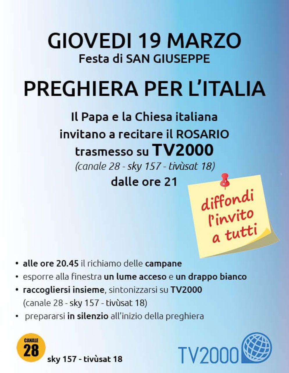 Sarà una preghiera corale degli italiani insieme al Papa e ai loro vescovi (stanno aderendo tutte le diocesi) per invocare la protezione di san Giuseppe, Custode del Signore e dell’umanità. L'iniziativa è stata indetta dalla Conferenza episcopale italiana con un appello nel quale ha comunicato che “in questo momento di emergenza sanitaria, la Chiesa italiana promuove un momento di preghiera per tutto il Paese, invitando ogni famiglia, ogni fedele, ogni comunità religiosa a recitare in casa il Rosario (Misteri della luce), simbolicamente uniti alla stessa ora: alle 21 di giovedì 19 marzo, festa di San Giuseppe, Custode della Santa Famiglia. Alle finestre delle case si propone di esporre un piccolo drappo bianco o una candela accesa”.