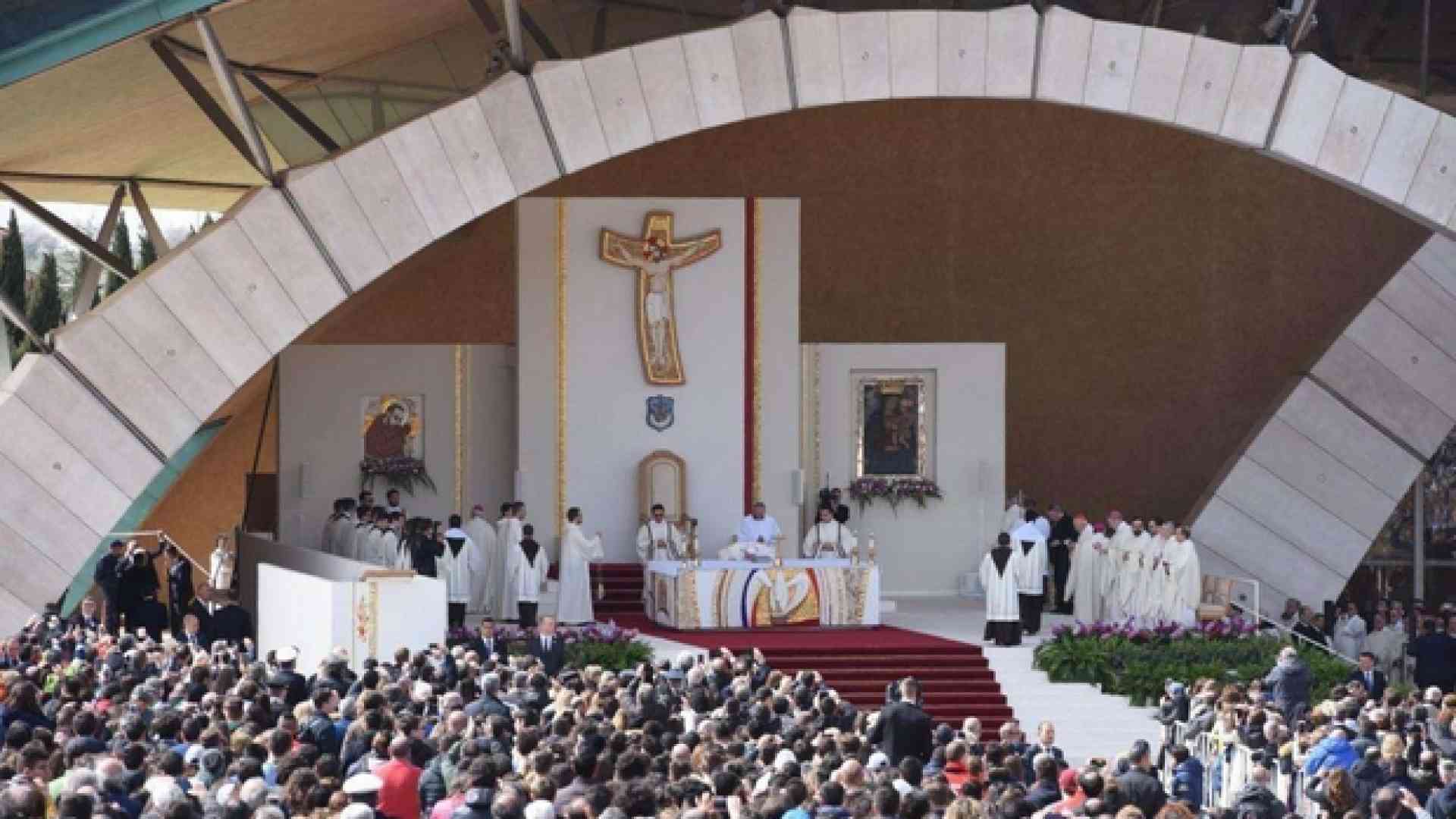 Quindi l'ingresso in papamobile sul sagrato per la Messa, solcandolo tra l'entusiasmo della folla, fino al palco con l'altare, addossato alla facciata della chiesa nuova.