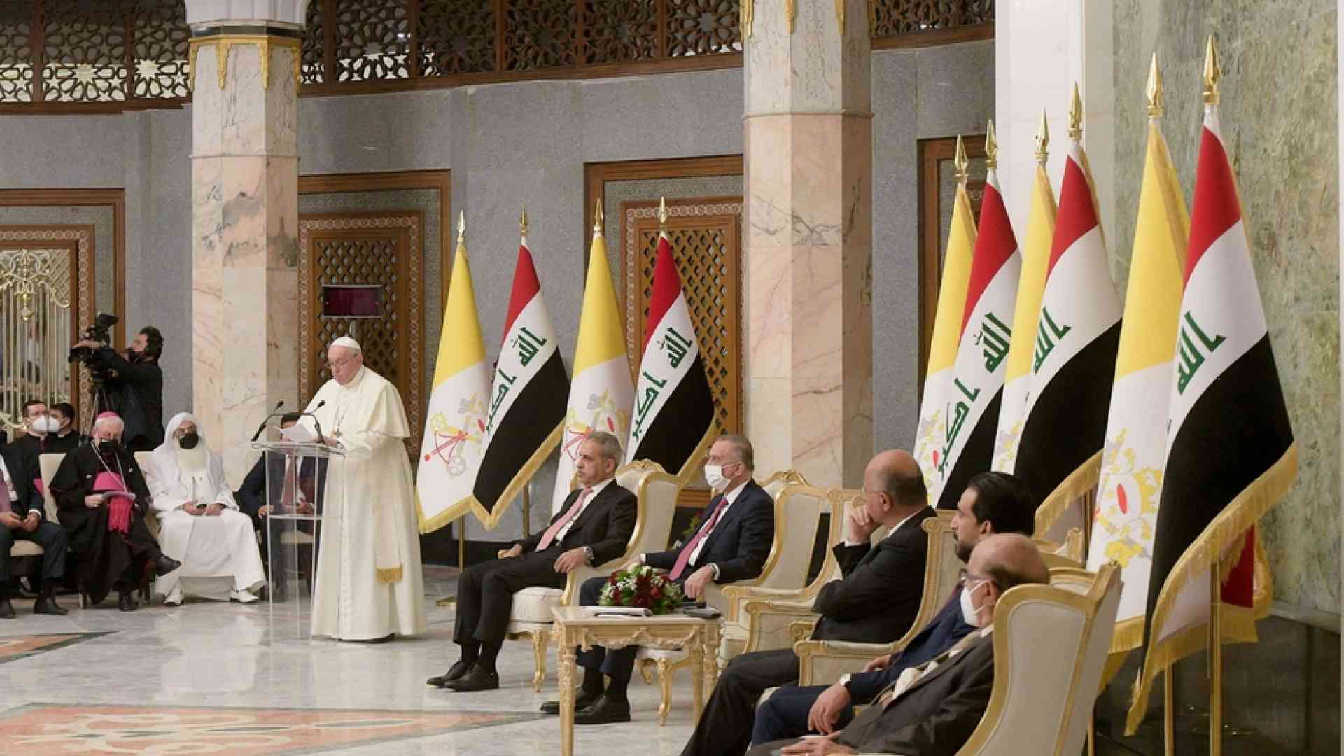 Nella grande sala del Palazzo della Repubblica, un tempo residenza di Saddam Hussein e poi ambasciata americana, risparmiata dai raid aerei durante la seconda Guerra del Golfo, papa Francesco è arrivato in compagnia dell’ingegnere di formazione anglosassone Barham Ahmed Salih Qassim, attuale presidente dell’Iraq. I toni di Papa Francesco – che già due anni fa non aveva risparmiato parole vibranti sui mercanti di armi che hanno alimentato le guerre irachene – sono quelli di un uomo di pace, che viene come costruttore di pace in un Paese che negli ultimi quattro decenni ha visto la deflagrazione e la rovina prodotta da quattro conflitti che hanno stremato la popolazione e dove l’antichissima presenza dei cristiani risalente all’eta apostolica che era costituita da più di un milione di fedeli prima dell’invasione USA del 2003 è ora ridotta a 300mila fedeli.