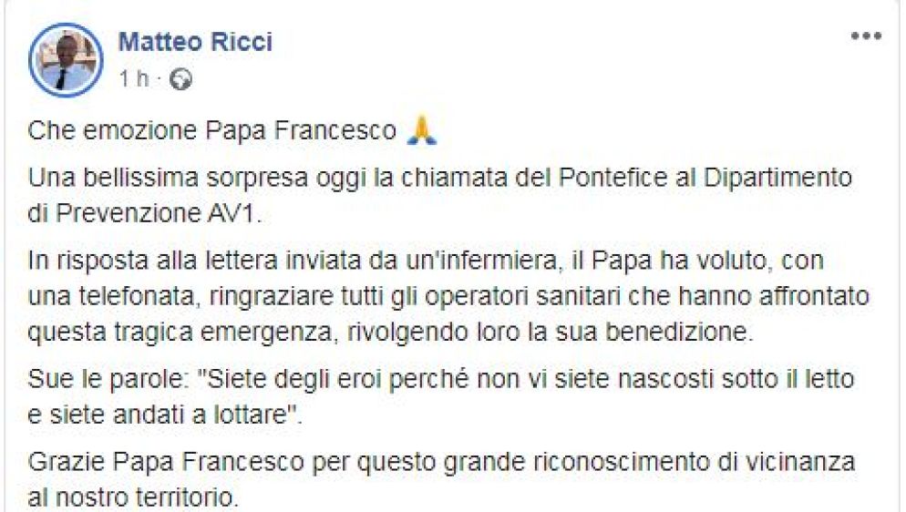 Una telefonata di papa Francesco giunta del tutto inaspettata lunedì sera. A riceverla è Irene M., una giovane operatrice sanitaria del dipartimento di prevenzione dell’Aerea Vasta 1.