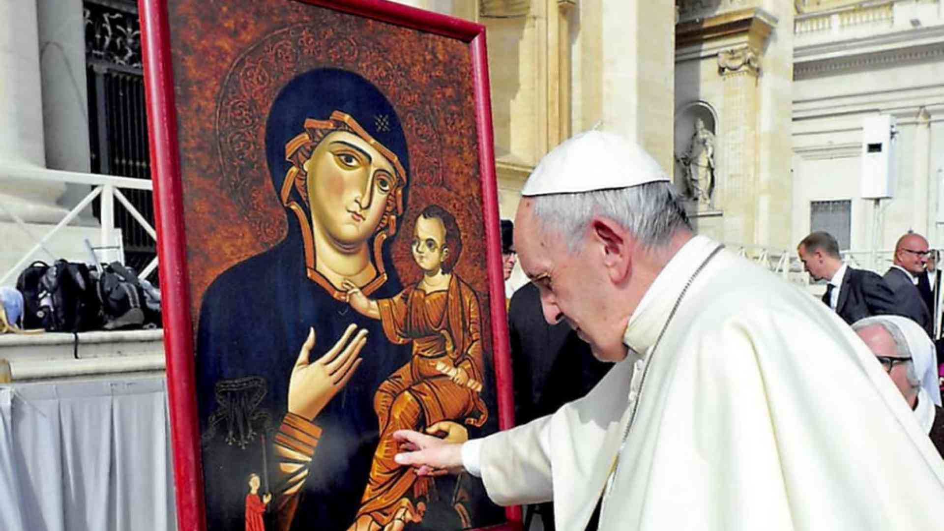 Al termine del suo discorso Francesco, parlando a braccio, si è riferito ad un’opera del teologo e artista gesuita padre Marko Rupnik, ad «un quadro, che sembra essere un quadro della Madonna, e non lo è». «Sembra – ha spiegato il Papa – che la Madonna sia in primo piano, e invece il messaggio è: la Madonna non è in primo piano. Lei riceve Gesù, e con le mani, come scalini, lo fa scendere.