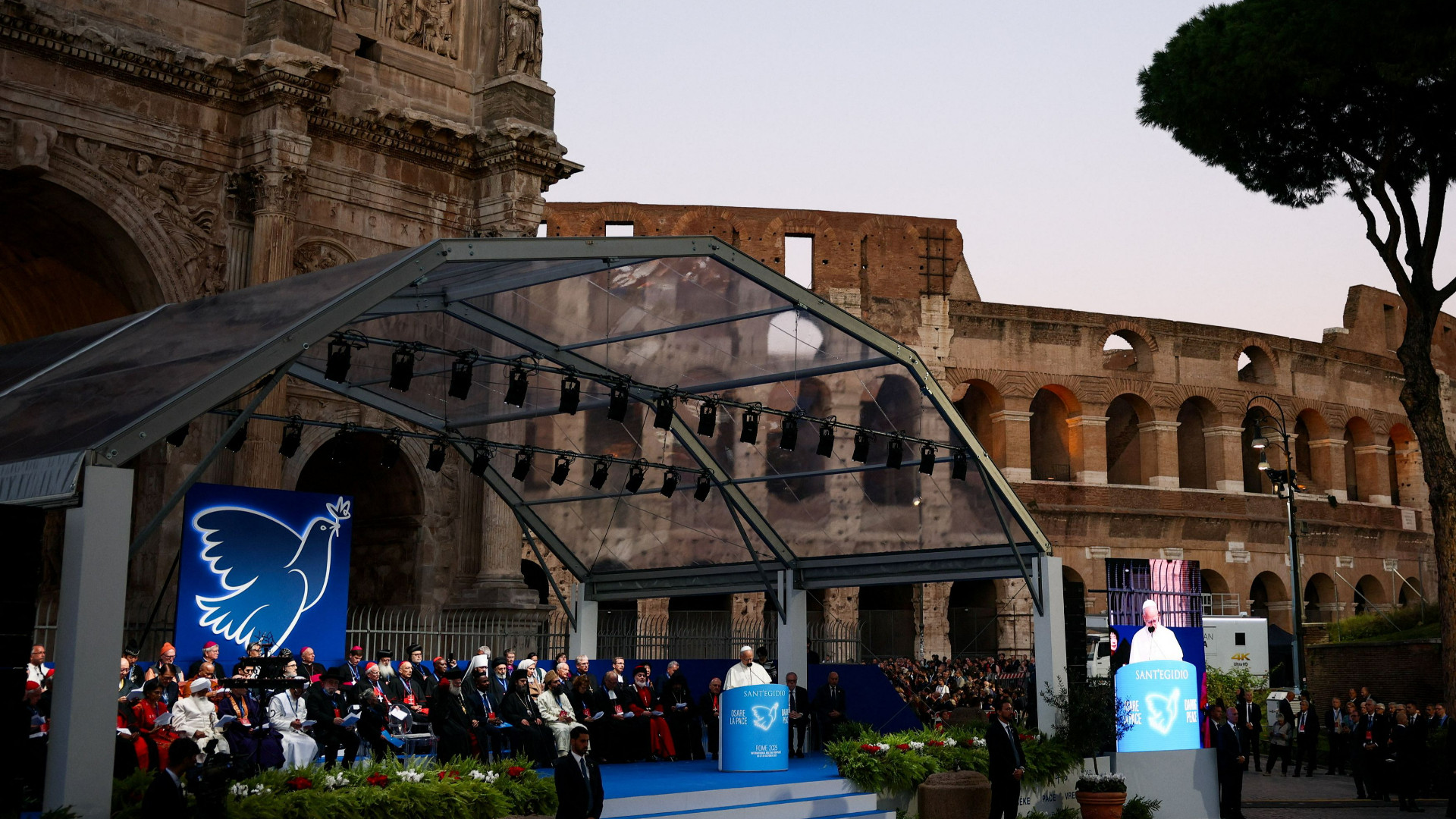 Leone XIV con i leader religiosi al Colosseo per l’incontro di Sant’Egidio. «Il mondo ha sete di pace. Mai la guerra è santa, solo la pace è santa». Il richiamo ai governanti: «Sì, al dialogo e al negoziato. Devono farlo! Esistono le sedi e le persone per giungerci»