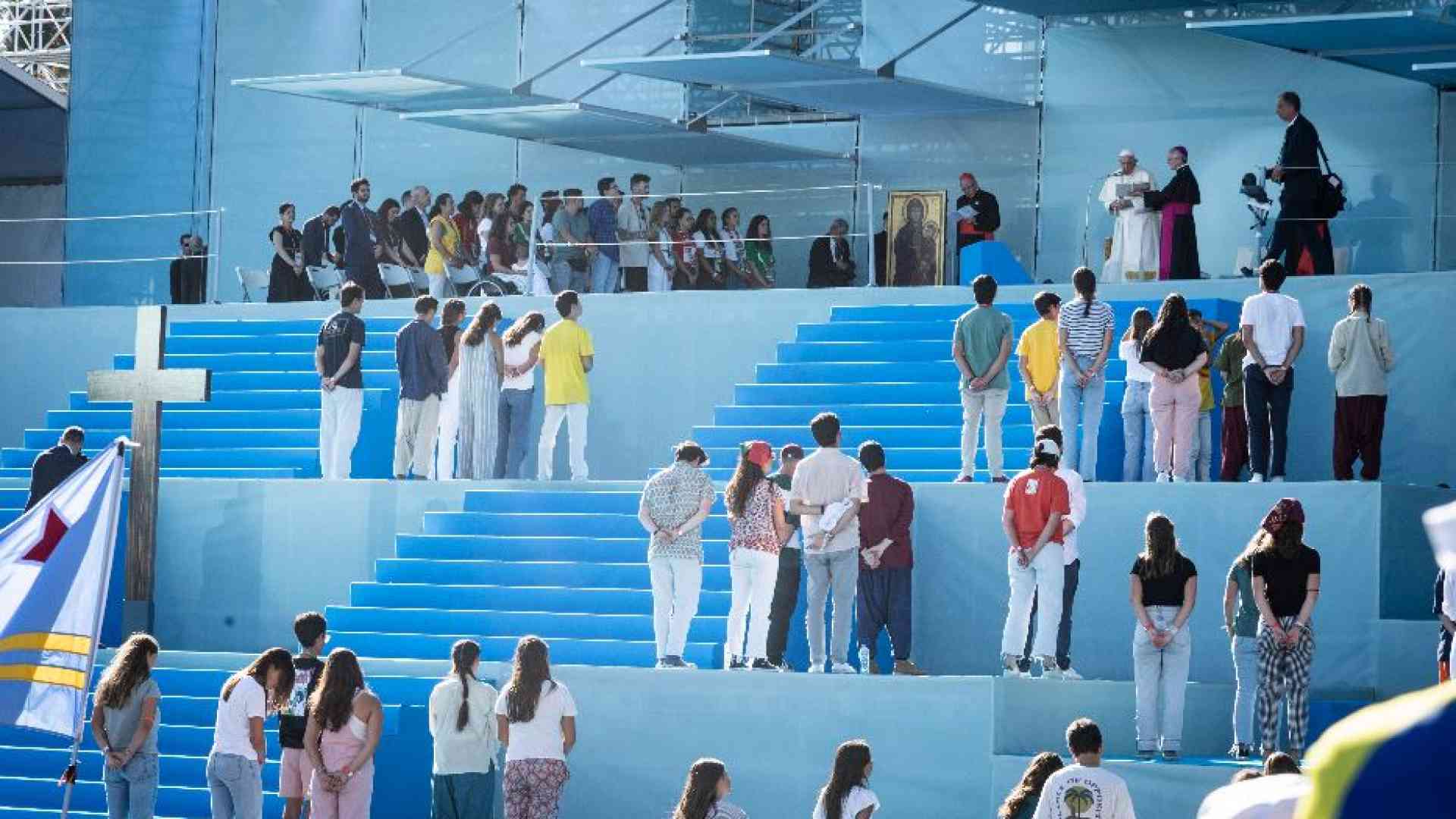 Sui maxischermi scorrono le testimonianze di tre ragazzi. Esther, 34 anni, spagnola, rimasta su una sedie a rotelle dopo un incidente. Racconta della sua vita lontana da Dio, di relazioni more uxorio e anche di un aborto "perché pensavo che il bambino non fosse ancora una persona". Fino a quando ha riscoperto l’abbraccio di Dio grazie ai Centri di orientamento familiare e ora è sposata con Nacho. Il portoghese Joao di 23 anni, vittima di bullismo a scuola, racconta di essere andato in crisi per paura della pandemia. E di come ne sia uscito grazie all’aiuto di chi nella Chiesa l’ha accolto. Infine Caleb, 29 anni, degli Stati Uniti, ferito dal «divorzio orribile» dei suoi genitori, fino a diventare tossicodipendente, dice di se stesso: «Sono una pecorella smarrita che Gesù è venuto a cercare» attraverso una donna che ora è sua moglie e che lo ha riportato nella Chiesa cattolica.