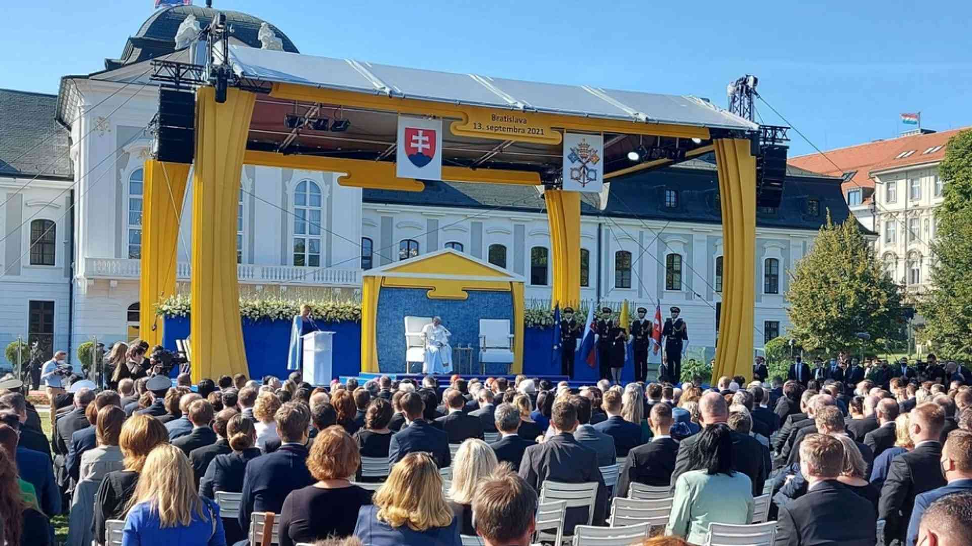 Per la Slovacchia il Papa - che nel giardino è giunto in caddy, veicolo elettrico di solito usato sui campi dal golf, subito dopo l'incontro privato con la presidente - ha auspicato che il Paese continui a essere "un messaggio di pace nel cuore dell'Europa". E ha invitato a prendere esempio dai santi Cirillo e Metodio. "La solidità della loro fede si traduceva, ha detto il Papa, in una spontanea apertura". Quindi, prendendo spunto dal pane e sale che gli erano stati offerti all'arrivo, Francesco ha ricordato che il pane si spezza e si condivide. Dunque bisogna prendersi cura dei più deboli. "Nessuno venga stigmatizzato o discriminato", ha esortato il Pontefice. Venga combattuta la corruzione e promossa la giustizia e non manchi mai il pane del lavoro. Occorre poi il "il sale della solidarietà". E si educhino a questo soprattutto i giovani. "L'ingrediente che manca è la cura degli altri. Sentirsi responsabili per qualcuno dà gusto alla vita e permette di scoprire che quanto diamo è in realtà un dono che facciamo a noi stessi". Perciò il Papa ha messo in guardia da una mentalità che svuota di senso la libertà, riconducendo il progresso al guadagno e i diritti ai soli bisogni individualistici. Tuttavia la fede non va propagata con "le guerre culturali, ma con la semina paziente del Regno di Dio". E specie in tempi di pandemia "occorre rimboccarsi le maniche per costruire insieme il futuro".