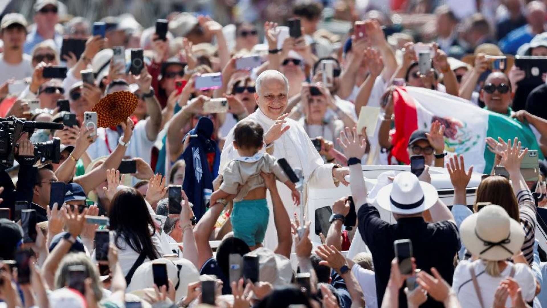 Il Pontefice attraversa l’emiciclo del colonnato di Bernini in papamobile per salutare i fedeli. Bacia i bambini e firma anche un autografo.