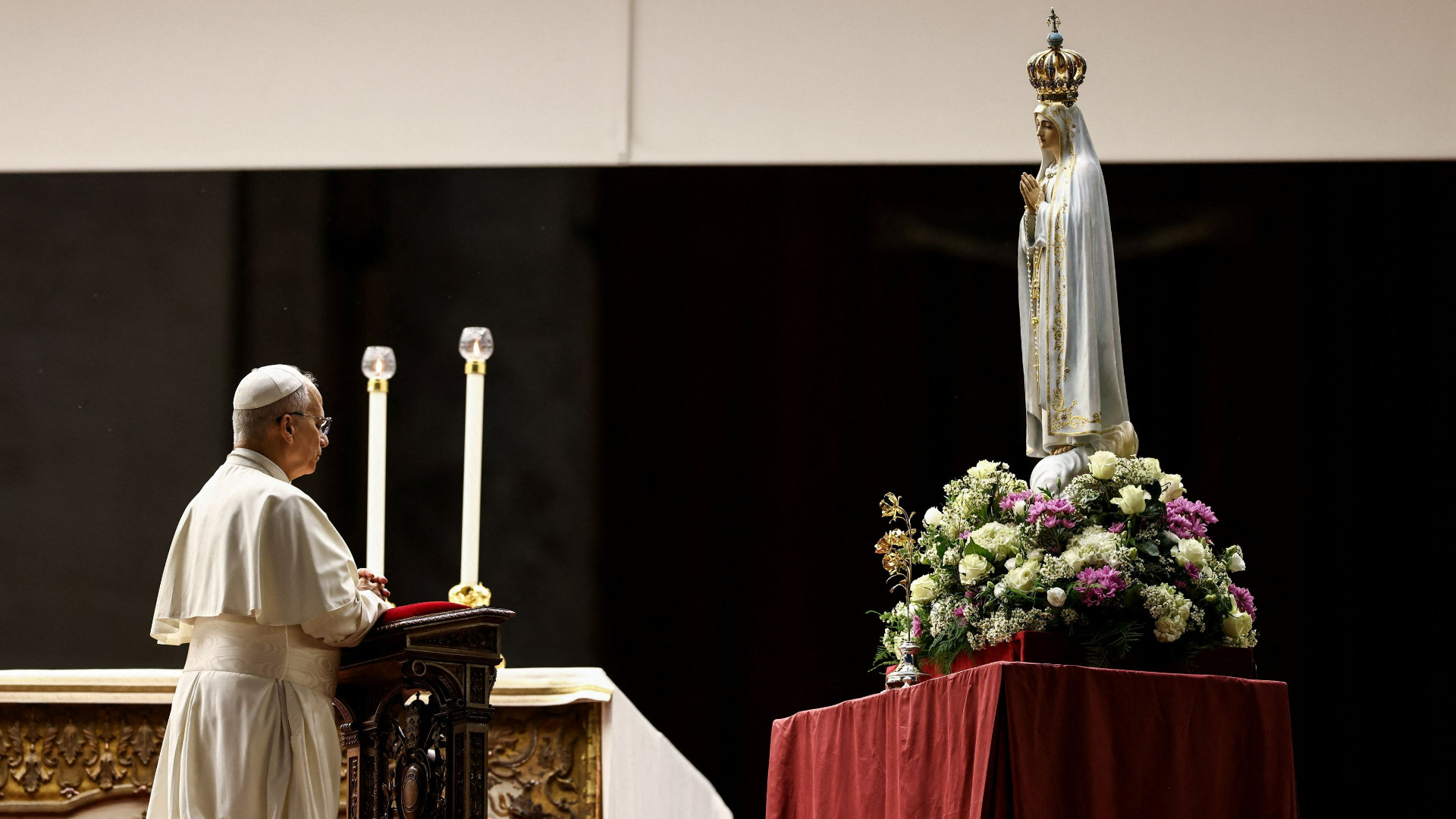 Il Rosario per la pace in piazza San Pietro davanti alla statua della Madonna di Fatima. «La pace non è deterrenza ma fratellanza; non è frutto di vittorie, ma di giustizia e perdono». Il richiamo: dai popoli sale un anelito contro le guerre. Sui negoziati: «Coraggio, avanti»