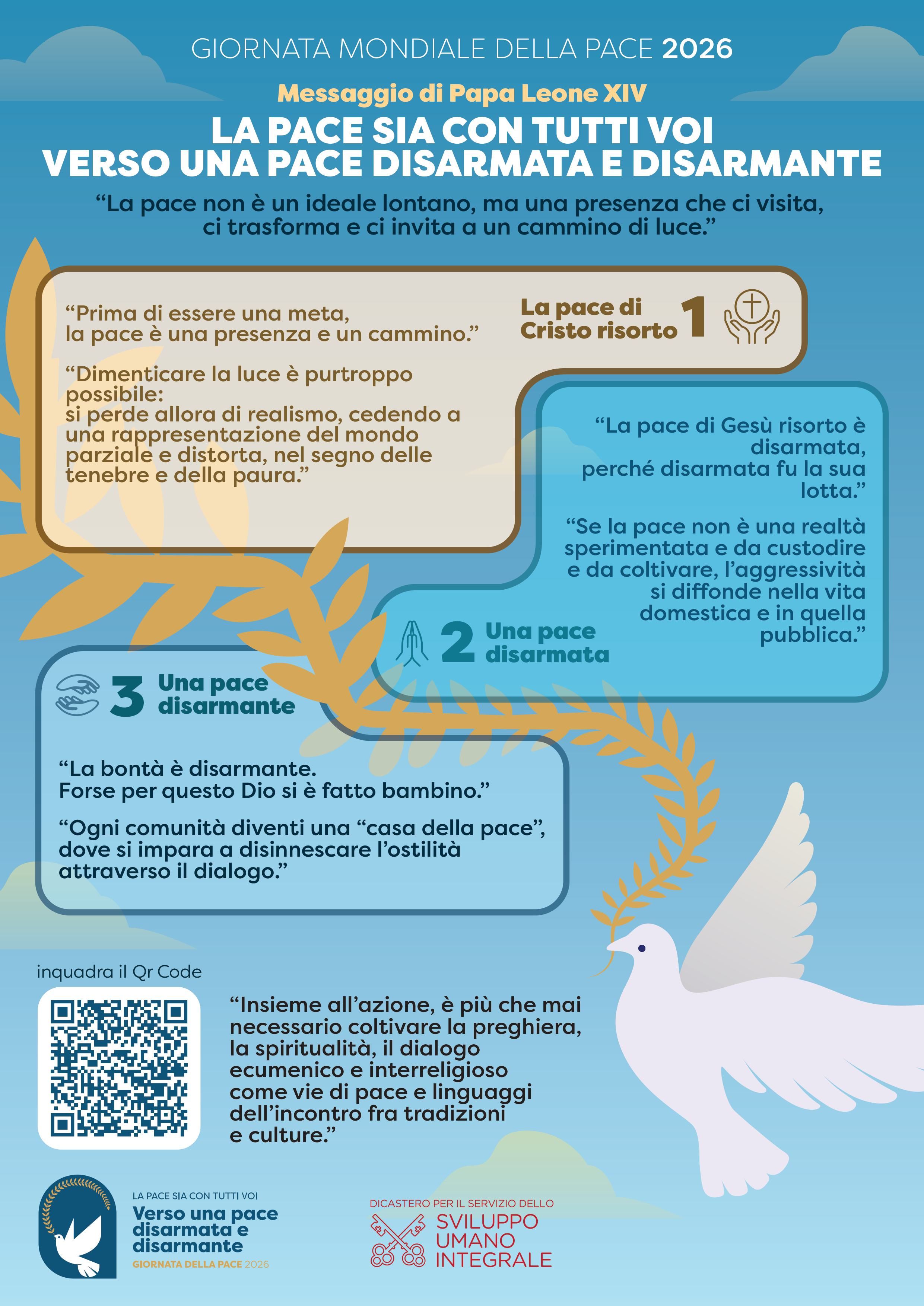 Il messaggio di Leone XIV per la Giornata mondiale della pace. La denuncia: «Programmi educativi che giustificano le guerre. È blasfemia benedire il nazionalismo e la lotta armata». Il richiamo: dalla paura alla fiducia, è l’ora della diplomazia disarmante. «La pace unisce credenti e non credenti, accogliamola e custodiamola»
