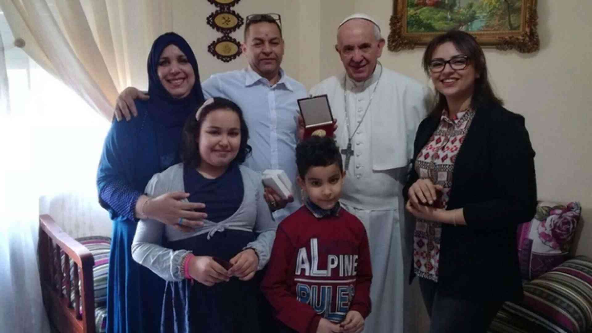 La terza famiglia è di origine marocchina musulmana: la moglie Hanane, il papà Abdel Karim e 3 figli di 17, 10 e 7 anni. La famiglia ha preparato al Papa un piccolo rinfresco con dolcetti, frutta secca e datteri. Il Papa ha bevuto il latte che gli hanno offerto e loro sono rimasti molto colpiti da questo gesto. I genitori sono in Italia dal 1987, nei caseggiati vivono dal 2000. Hanane è attiva con la parrocchia, aiuta nelle feste. Il ragazzino più piccolo ha preparato un disegno per il Papa: si vede una chiesta, una moschea e loro tre fratelli che giocano davanti. Hanno fatto molte foto e anche un selfie.