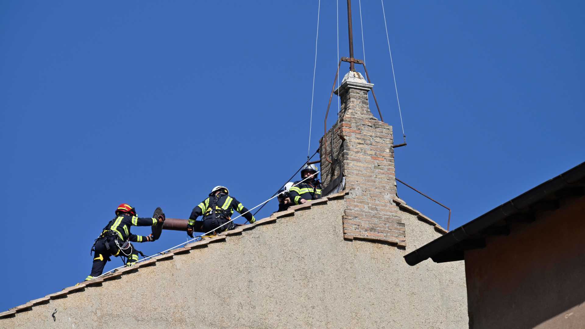 Vigili del fuoco vaticani al lavoro questa mattina, in vista del Conclave che inizierà il 7 maggio alle 16,30. Il comignolo è collegato a due stufe. Insieme alla fumata decisiva anche le campane