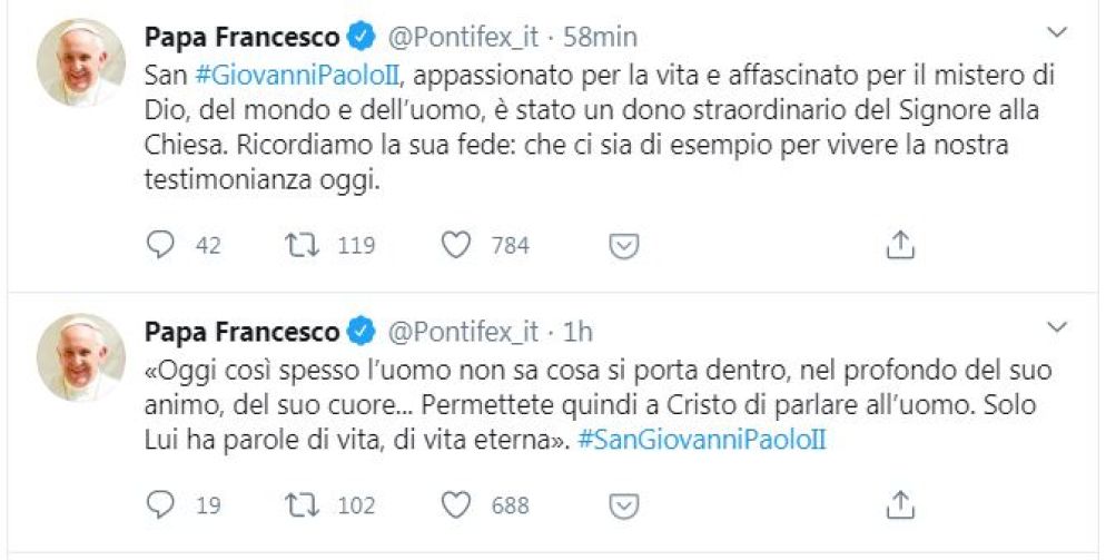 I tweet di papa Francesco: "San #GiovanniPaoloII, appassionato per la vita e affascinato per il mistero di Dio"
