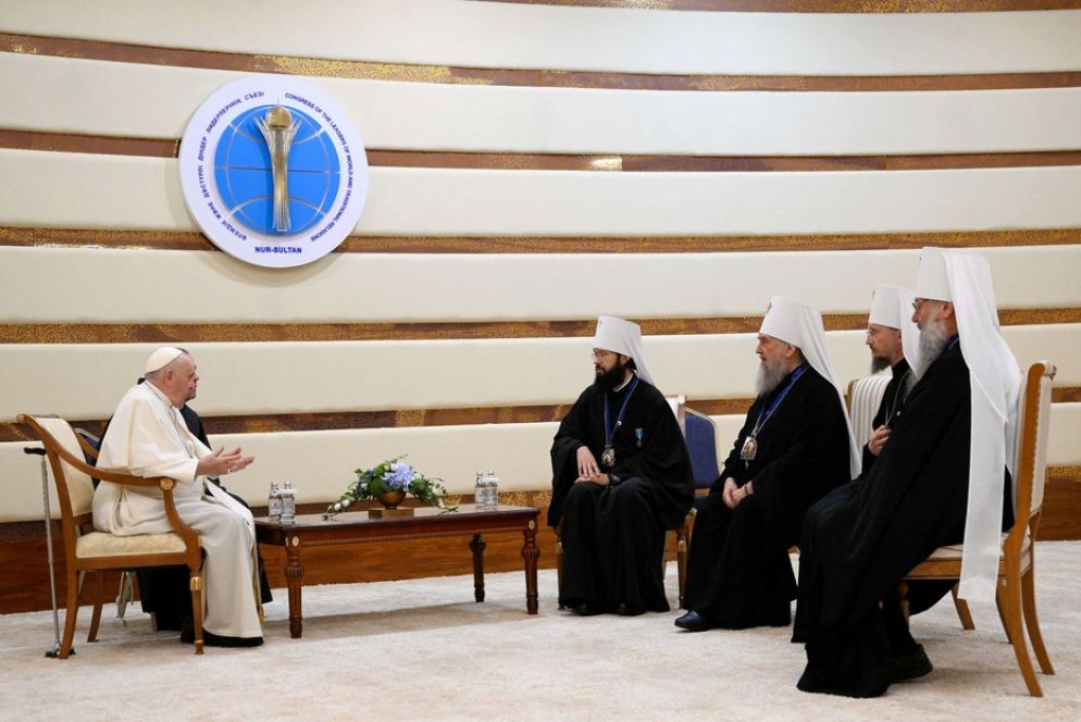E conclude con l’invocazione che «l’Altissimo ci liberi dalle ombre del sospetto e della falsità; ci conceda di coltivare amicizie solari e fraterne, attraverso il dialogo frequente e la luminosa sincerità delle intenzioni. Non cerchiamo finti sincretismi concilianti, ma custodiamo le nostre identità aperti al coraggio dell’alterità, all’incontro fraterno». Nella sede del Ministero degli Affari Esteri della capitale Nur-Sultan, nel frattempo è stato sottoscritto un Accordo tra la Santa Sede e la Repubblica del Kazakhstan, che consolida ulteriormente i vincoli di amicizia e di collaborazione tra le due parti già esistenti dal 1998. Centootto le delegazioni presenti nell'affollata sala blu del Palazzo dell’Indipendenza. Solamente sei le donne attorno al tavolo. Dopo la foto di gruppo, Papa Francesco ha incontrato, in forma privata, alcuni leader religiosi, tra i quali il grande imam di Al-Azar, Muhammad Al Tayyeb, David Lau, Rabbino capo Askanezita d'Israele e il metropolita Antonij di Volokolamsk, con il quale papa Francesco si è intrattenuto in un incontro che è durato 15 minuti. Un incontro nel quale il Papa ha mandato i saluti al patriarca di Mosca Kirill.