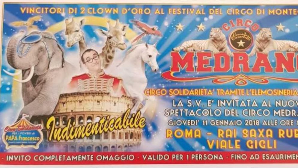 Sarà il Circo Medrano ad andare in scena giovedì 11 gennaio, in viale Gigli a Saxa Rubra. A disposizione i 2.100 posti del grande tendone per questo evento di carità che la famiglia Casartelli e l'imprenditore Fabrizio Grandi hanno voluto chiamare "Circo Solidarietà per i poveri del Santo Padre". L'arcivescovo elemosiniere Konrad Krajewski in una nota ha citato quanto affermato da papa Francesco in una recente udienza generale, quando ha detto che "la gente che fa spettacolo nel circo crea bellezza, sono creatori di bellezza. E questo fa bene all'anima. Quanto bisogno abbiamo di bellezza!".