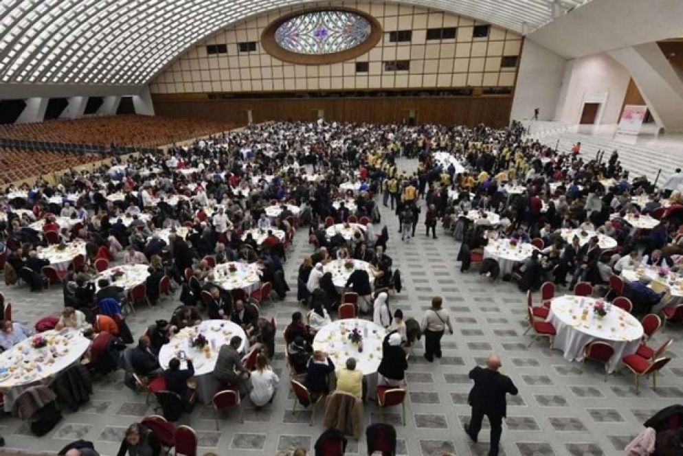 L'Aula Paolo VI al termine dell'Angelus si è trasformata, in occasione della III Giornata mondiale dei Poveri, in un grande ristorante che accoglie tutti: il pranzo del Papa con 1.500 persone bisognose in Vaticano - una "riunione di amici", la definisce Francesco. Oltre 150 tavoli e 50 volontari a servire gli ospiti, trattati con tutti riguardi.