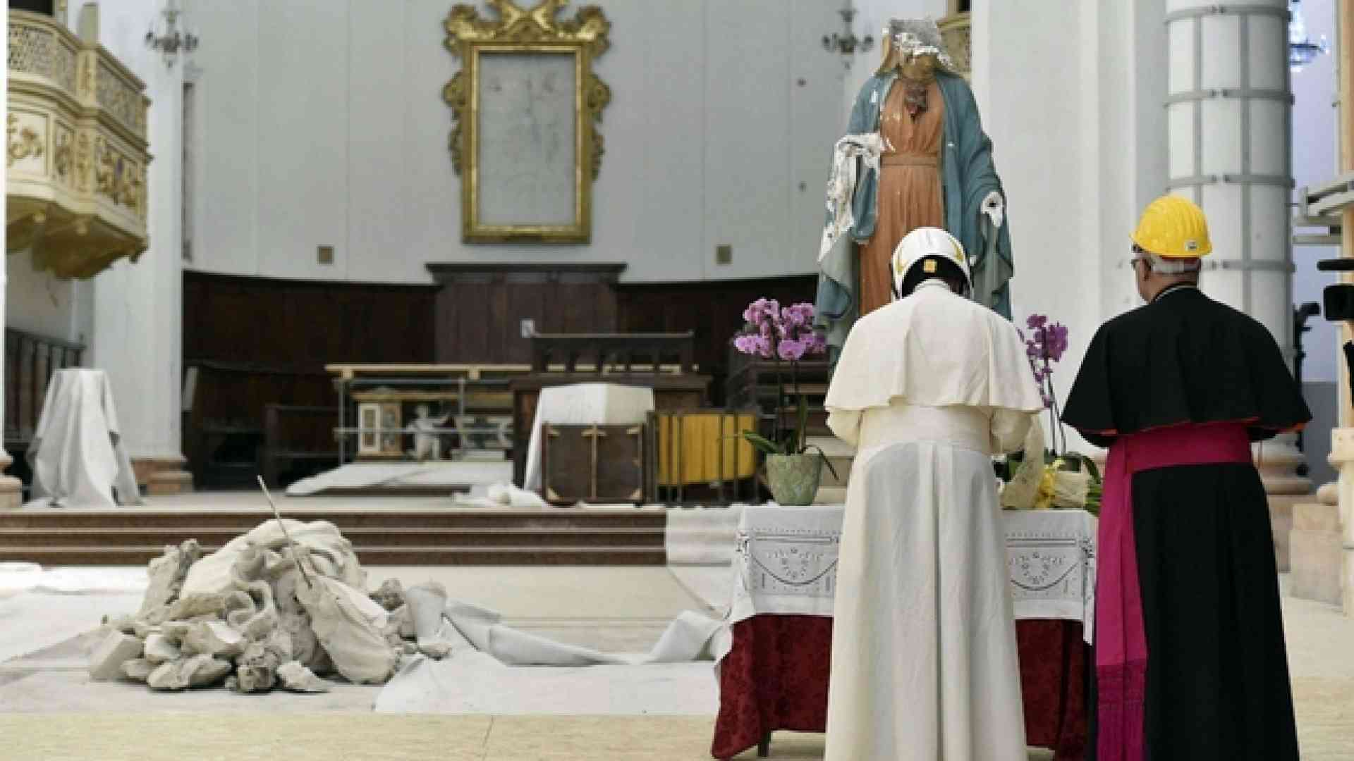 La visita in Cattedrale. In auto, poi, Francesco raggiunge piazza Cavour e prima di indossare i paramenti liturgici per la celebrazione eucaristica, entra nel Duomo ferito. I vigili del fuoco gli danno un casco bianco con la scritta "Francesco" e lui se lo mette in testa. Poi va a deporre un mazzo di fiori ai piedi della statua della Madonna che stava di fianco all'altare maggiore e alla quale il sisma ha mozzato la testa e le braccia. Quindi, poco prima della Messa, saluta nel chiostro del palazzo arcivescovile.
