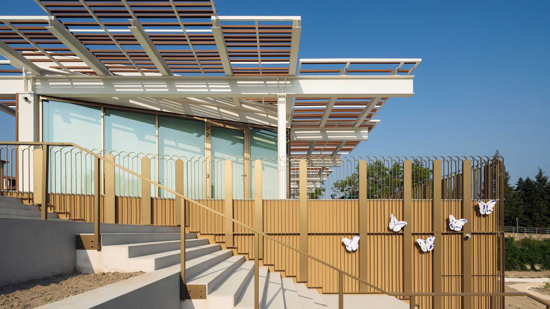 L’edificio, sempre a firma di Femia, si trova ai bordi della Strada Blu, la provinciale 28 che attraversa i campi di Varano. Un luogo che si caratterizza per il senso di leggerezza ottenuto tramite l’uso dei materiali, ampie vetrate e giochi di trasparenze che entrano in perfetta armonia con il territorio. Una danza lieve incarnata anche dalle farfalle in ceramica bianca e blu posate sulle pareti della Fondazione. Ma è ben oltre una posa estetica: è la convinzione che un’impresa non esista senza il suo territorio, perché senza relazioni e intrecci tra comunità operosa e comunità di cura, i luoghi si svuotano. « Nelle comunità, il problema principale è la solitudine che conduce all’isolamento sociale», sottolinea la vicepresidente Angelica Dallara. «Con la Fondazione ci proponiamo di contrastare questo senso di estraneità attraverso progetti che “facciano comunità”».