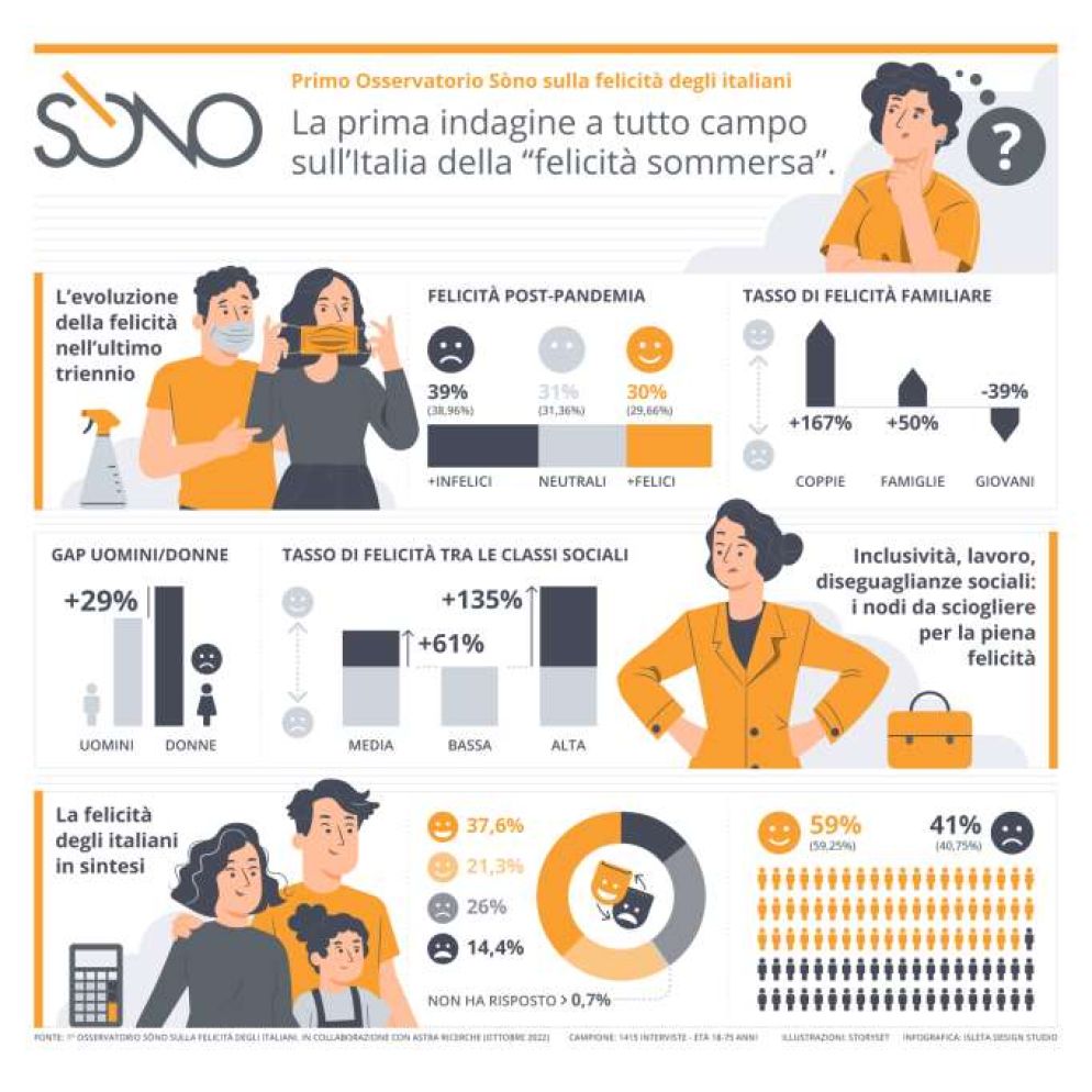 Sempre più pessimisti, insoddisfatti, incattiviti: in poche parole tutto tranne che felici. Questo, a prima vista, sembrerebbe lo sconfortante ritratto degli italiani a fine 2022. Siamo sicuri, però, che sia una rappresentazione fedele? Le informazioni raccolte nel primo Osservatorio Sòno sulla felicità degli italiani ci invitano a riconsiderare in tutta la sua complessità il rapporto dei nostri connazionali con la felicità.