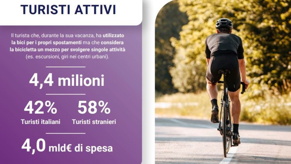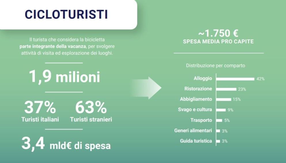 Guardando alla fotografia scattata da Banca Ifis l’impatto economico del turismo della mobilità dolce si è concretizzato in 7,4 miliardi di euro di spesa: della quale, per quanto riguarda il cicloturismo vero e proprio, hanno beneficiato soprattutto piccole e medie imprese. In primis, le tantissime strutture ricettive (1,4 miliardi di euro) che ospitano le persone dopo la giornata a pedali, va molto bene anche l’ambito della ristorazione (0,8 miliardi), perché una cena fuori dopo 60-70 chilometri in sella diventa quasi una necessità, l’abbigliamento (0,5 miliardi) con capi tecnici indispensabili per avere un certo comfort nella pedalata e, infine, le attività del tempo libero e del divertimento (0,3 miliardi) che fanno da contorno a un viaggio cicloturistico che in media dura 11 giorni.