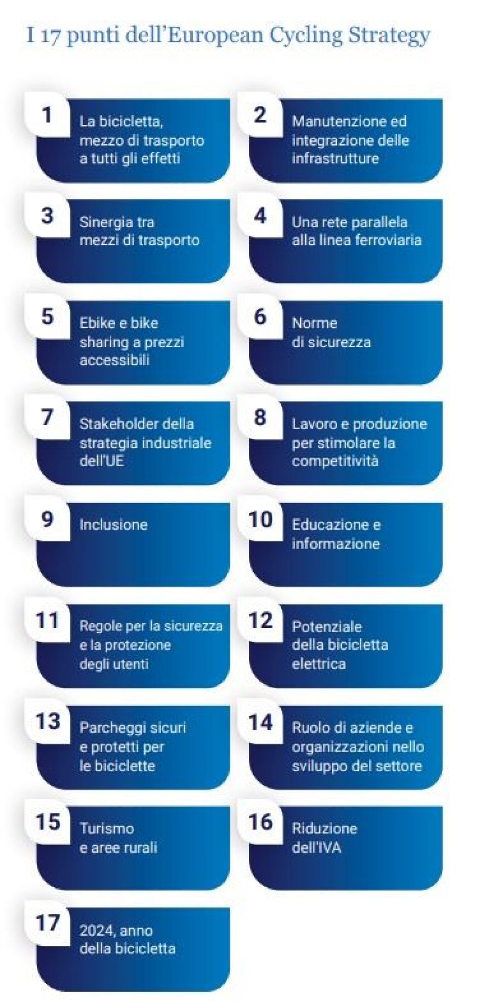 Aderendo così a uno dei 18 punti del piano Cycling strategy approvato dal Parlamento europeo che racchiude, tra l’altro il raddoppio del numero di chilometri pedalabili entro il 2030, di cui 20mila solo in Italia e l’aumento dei punti ricarica delle e-bike in città.