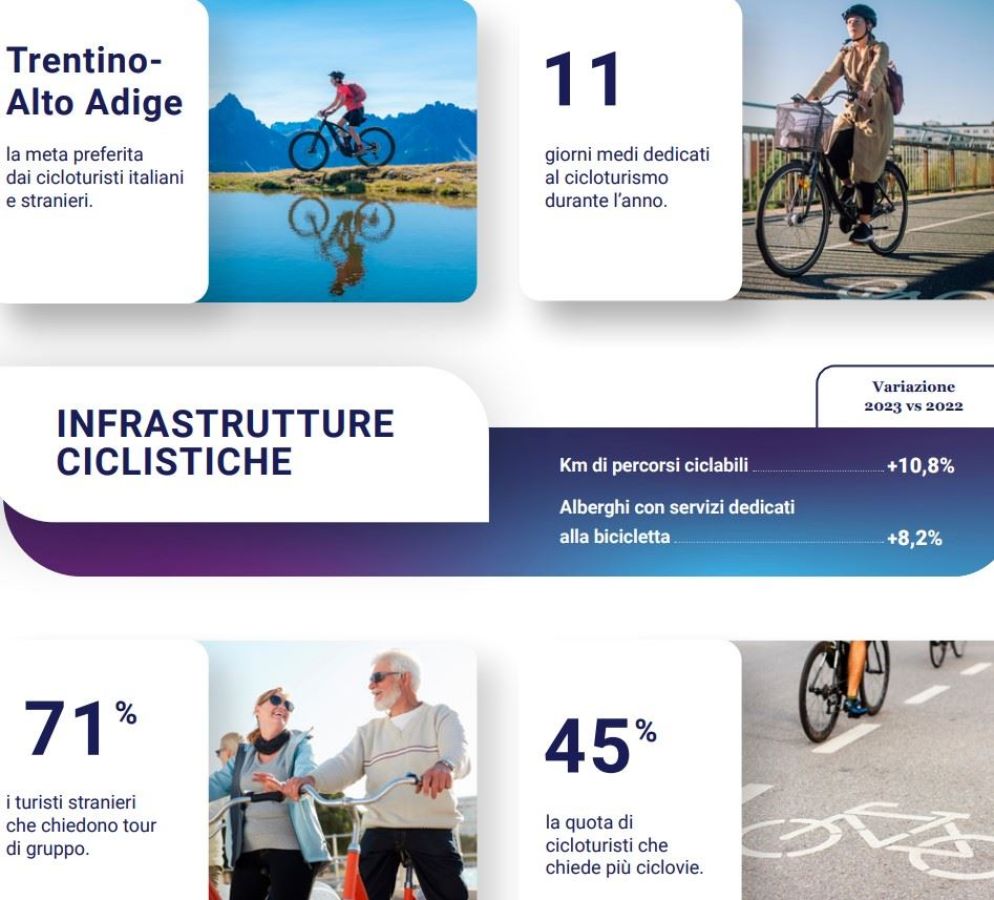 Le mete più apprezzate? Soprattutto sono nel Nord Italia e in particolare in Trentino Alto-Adige, regione apprezzata dai turisti stranieri per la sua ricettività e la forte presenza di piste ciclabili.