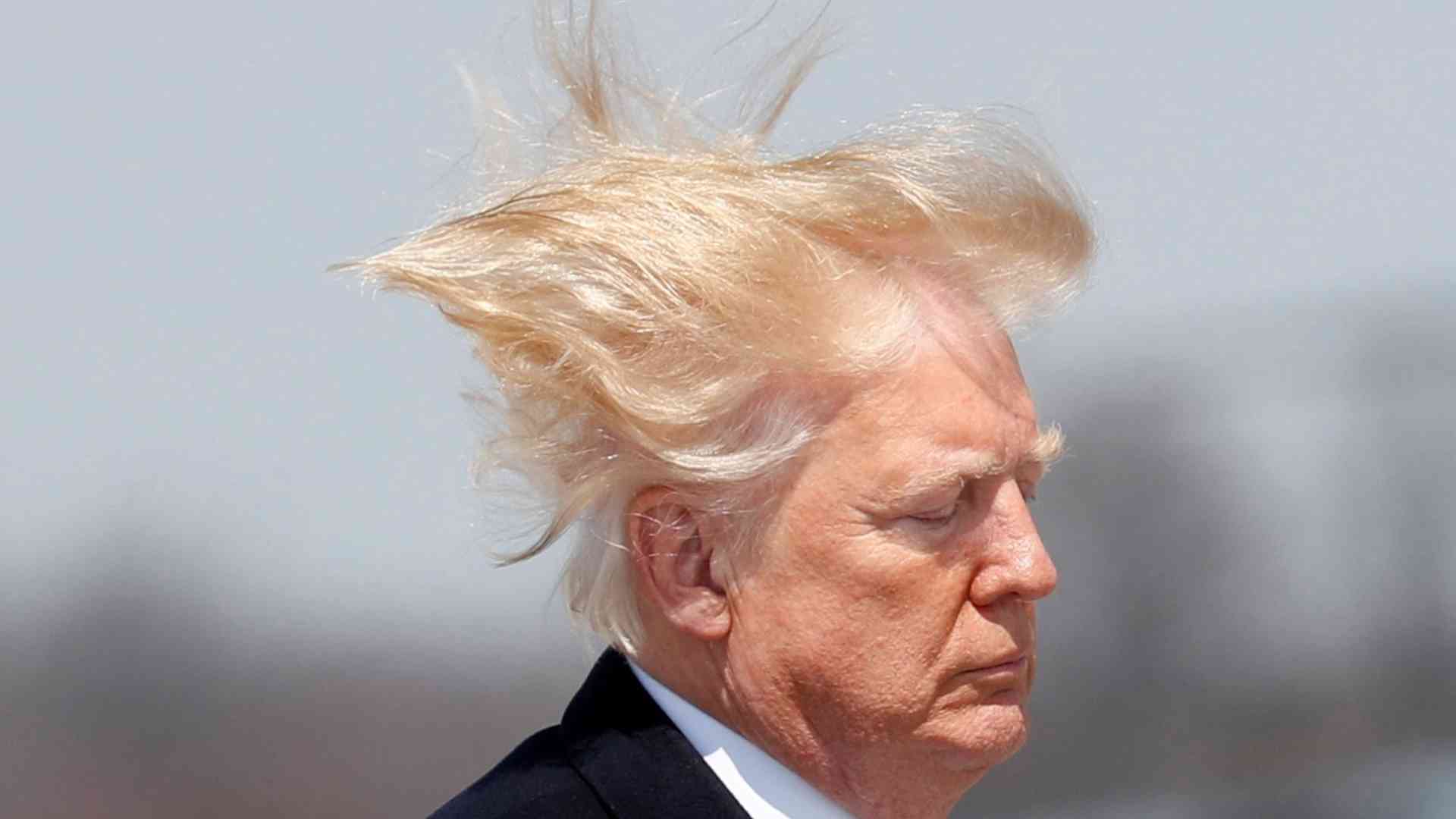 Reuters | Donald Trump si prepara a salire sull'Air Force One il 5 aprile del 2025, mentre l'aria dei motori gli scompiglia i capelli