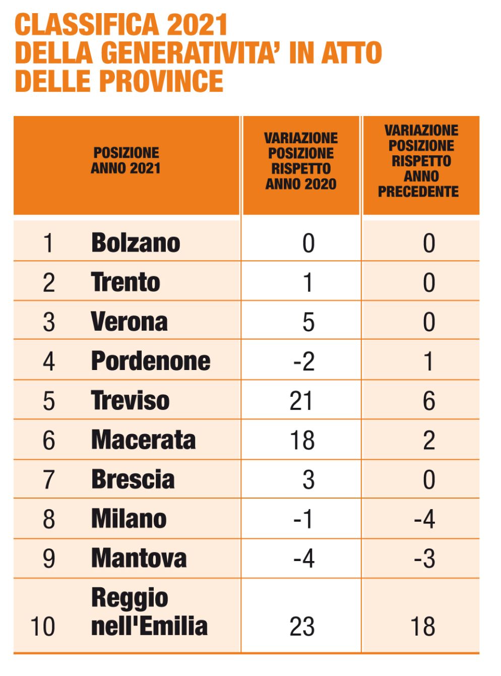 A loro volta i dati indicano che le persone più resilienti sono più felici, e questo quasi per definizione dato che la capacità di rialzarsi al più presto possibile dopo uno dei numerosi piccoli e grandi "colpi negativi" che la vita ti propone implica una minore porzione della propria vita vissuta "al tappeto" e dunque maggiore soddisfazione di vita. Nel rapporto si proiettano i concetti di generatività e resilienza dal livello individuale a quello di territorio misurando classifica e variazioni rispetto all’anno precedente della "generatività in atto" delle province italiane nelle sue diverse dimensioni (vivacità del tessuto d’impresa, delle organizzazioni sociali, longevità attiva, fertilità, quota ridotta di giovani che non lavorano né studiano).