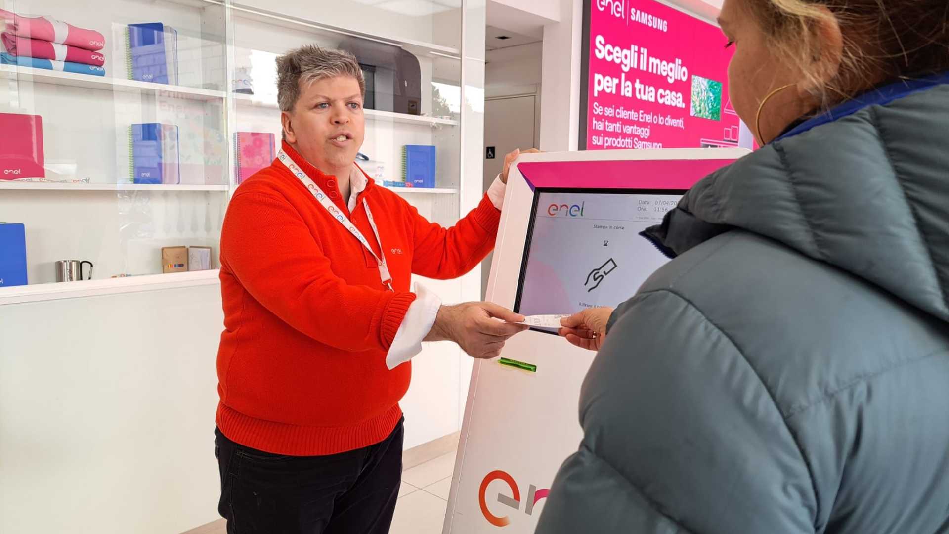 «Buongiorno, di cosa ha bisogno?», è con una semplice domanda e un sorriso contagioso che Matteo Rossetti accoglie ogni cliente che arriva allo Spazio Enel di Roma in cui lavora dal dicembre scorso. «Questa è la mia domanda fondamentale per iniziare a capire cosa vuole fare il cliente. Per esempio, pagare una bolletta o fare un contratto. In base a questo gli do il biglietto giusto, lo faccio accomodare nella sala d’attesa oppure lo accompagno direttamente dal consulente», ci spiega Matteo mentre continua ad accogliere clienti, tra uno scambio di battute, un sorriso, una pacca sulla spalla. Il clima è familiare è anche Matteo ci tiene a precisarlo che «qui mi sento a mio agio e ben voluto da tutti, anche con i colleghi si scherza sempre… ci conosciamo da poco, ma per me alcuni di loro sono diventati famiglia».