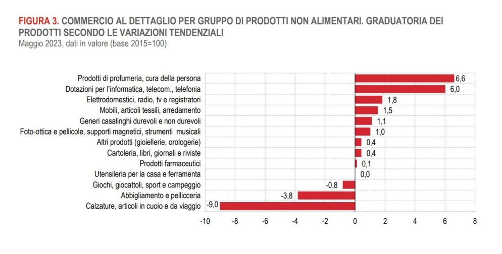 Per quanto riguarda i beni non alimentari, si registrano variazioni tendenziali eterogenee tra i gruppi di prodotti. L’aumento maggiore riguarda i prodotti di profumeria, cura della persona (+6,6%) e dotazioni per l’informatica, telecomunicazioni e telefonia (+6,0%), mentre registrano i cali più marcati i settori delle calzature, articoli in cuoio e da viaggio (-9,0%) e nell'abbigliamento e pellicceria (-3,8%).