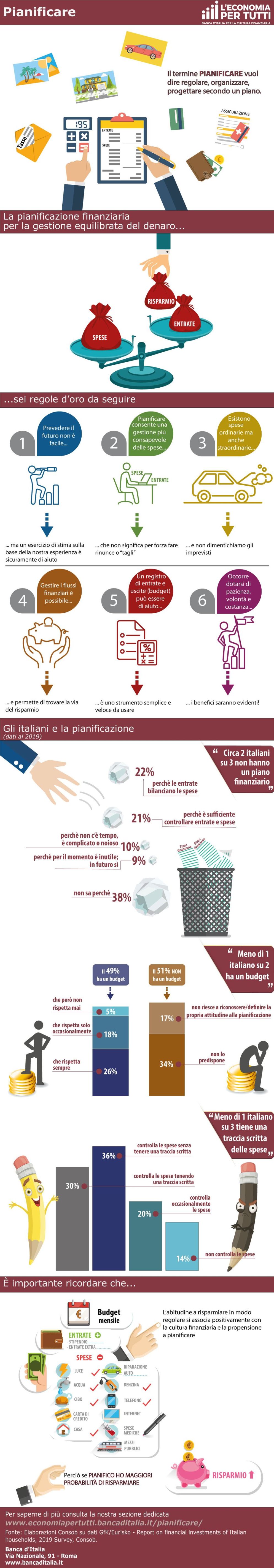 Pianificare è quindi un esercizio di programmazione e organizzazione. È importante perché aiuta a evitare di spendere o indebitarsi in modo insostenibile facendo il passo più lungo della gamba, a rispettare gli impegni finanziari presi (affitto, rate di prestiti, tasse…) e a risparmiare per realizzare obiettivi di vita o per affrontare eventuali difficoltà (un calo del reddito, spese inattese…).
