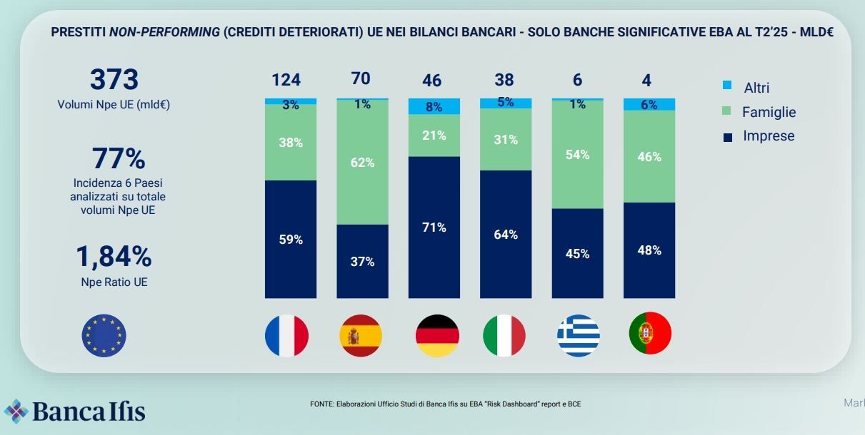 Sono queste le principali tendenze emerse nel corso della quattordicesima edizione del Npl Meeting, l’annuale appuntamento di Banca Ifis dedicato all’industria del credito deteriorato, a Villa Furstenberg a Mestre. Framework & Frontiers (Contesto e frontiere) il titolo scelto per tratteggiare lo scenario dei prossimi anni tra dazi Usa e crescita del Pil vicina alla zero (anche se i prestiti fanno segnare un aumento del 3%). Il rapporto Ifis, che analizza l’andamento degli Npl in sei Paesi, evidenzia un pericoloso aumento: lo stock delle banche significative dell’Ue è pari a 373 miliardi di euro, 16 miliardi in più rispetto al minimo storico del 2023. Un dato che nasconde una polarizzazione con un aumento signficativo in Germania (14 miliardi) e Francia (12 miliardi), con un’incidenza particolarmente alta nel settore immobiliare ma anche nel credito delle famiglie nel caso della Francia. Andamenti postivi invece per Italia, Spagna, Grecia e Portogallo, che registrano una riduzione dei crediti deteriorati.
