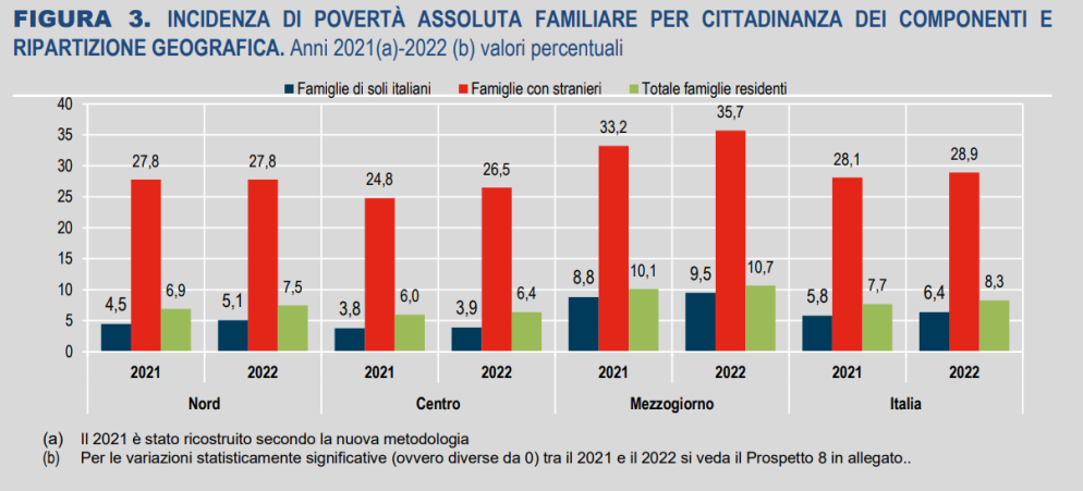 Gli stranieri in povertà assoluta sono oltre un milione e 700mila, con un’incidenza pari al 34,0%, oltre quattro volte e mezzo superiore a quella degli italiani (7,4%). Tuttavia, per questi ultimi si registra un incremento della povertà assoluta a livello nazionale (7,4% dal 6,9% del 2021), ma anche nel Nord e nel Mezzogiorno (rispettivamente 5,4% e 11,4%, da 4,9% e 10,6% dell’anno precedente).