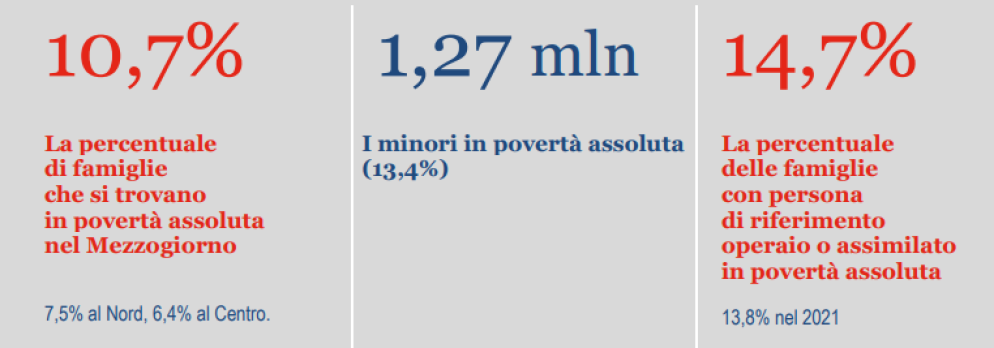 Nel 2022, la povertà assoluta in Italia interessa quasi 1 milione 269 mila minori (13,4%, rispetto al 9,7% degli individui a livello nazionale); l’incidenza varia dall’11,5% del Centro al 15,9% del Mezzogiorno.