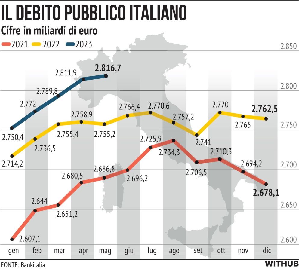 #Bankitalia a maggio 2023 il debito delle Amministrazioni pubbliche era pari a €2.816,7 mld, in aumento di €4,8 mld rispetto al valore di aprile 2023#leggiqui #Statistiche #FinanzaPubblica: fabbisogno e debito: https://t.co/41Nx0Z8xC9#thread 👇 pic.twitter.com/AgPr1sjAVC— Ufficio Stampa della Banca d'Italia (@UfficioStampaBI) July 14, 2023