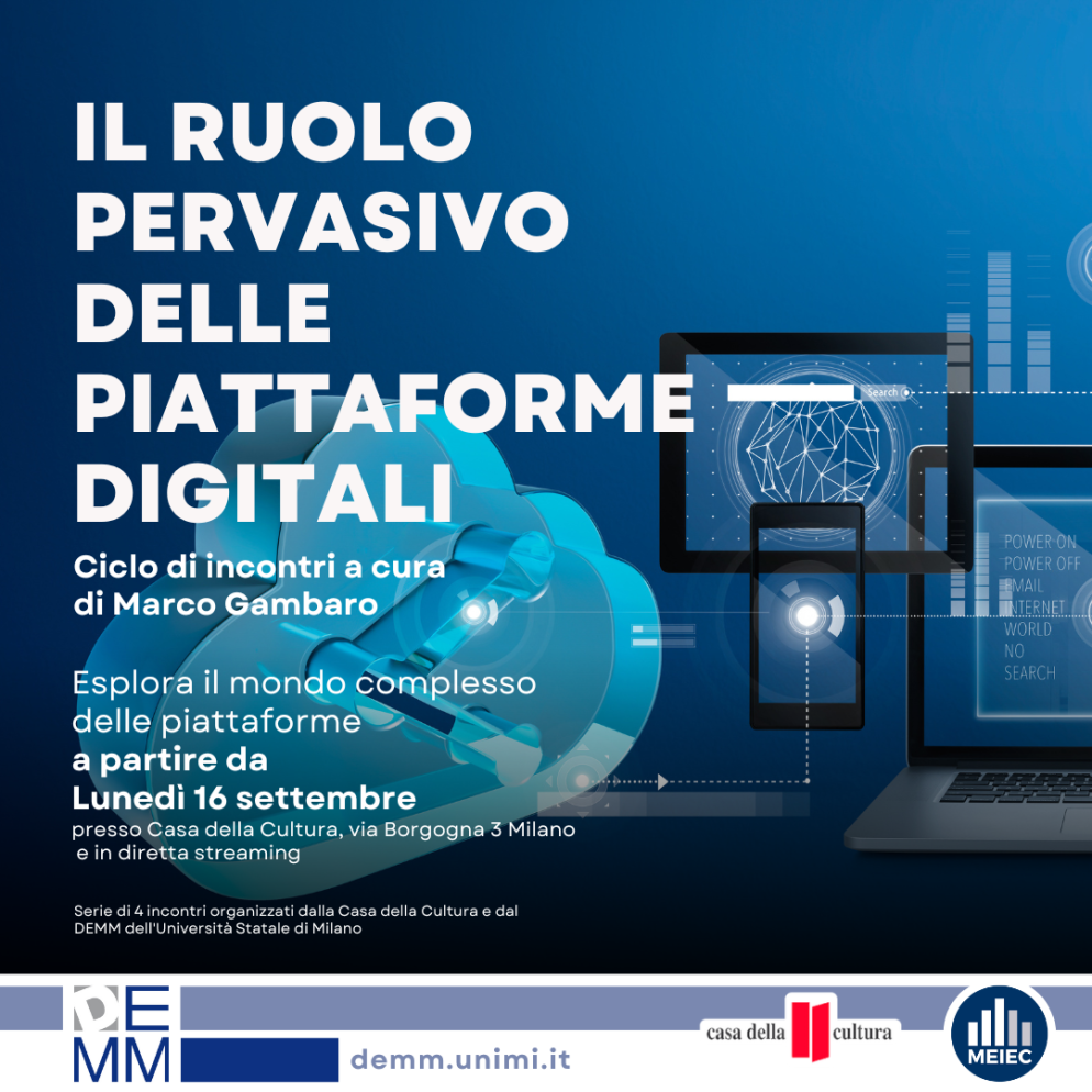 Le piattaforme digitali stanno ridisegnando vari aspetti della società e dell’economia, creando nuove opportunità e sfide. Su questo tema il Dipartimento di Economia Management e Metodi Quantitativi dell’Università Statale di Milano (DEMM) presenta un ciclo di quattro incontri, curati dal professor Marco Gambaro, docente di Economia dei media. Gli eventi sono realizzati in collaborazione con Casa della Cultura di Milano che li ospiterà: si inizia lunedì 16 settembre alle ore 18, con “Piattaforme streaming: come Netflix e Spotify hanno cambiato il nostro modo di consumare cultura”. A confronto altri due docenti dell’Università Statale di Milano: Lorenzo Zirulia, professore di Economia Industriale e Alessandro Gandini che insegna Sociologia dei processi culturali. Gli incontri successivi saranno il 30 settembre, il 14 e il 28 ottobre: tutti i dibattiti sono aperti al pubblico e trasmessi in diretta streaming sul sito internet, sulla pagina Facebook e sul canale YouTube di Casa della Cultura.