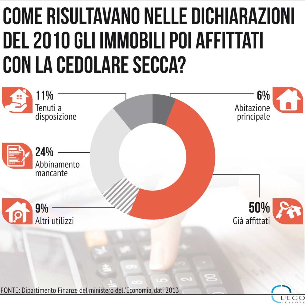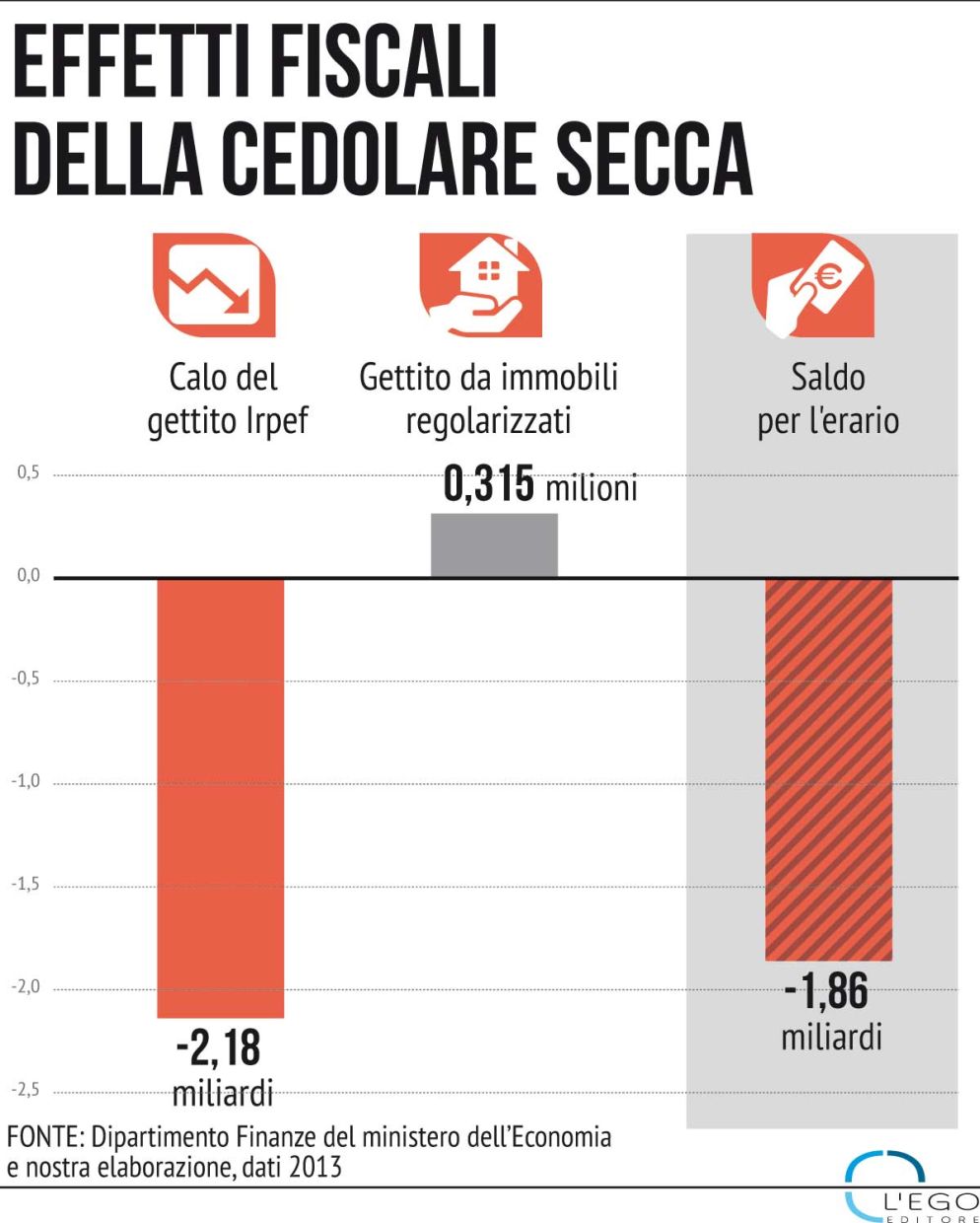 «Dalle analisi effettuate risulta che, nel 2013, la base imponibile emersa, a seguito dell’introduzione della “cedolare secca”, si colloca tra 1 e 1,5 miliardi di euro» conclude il rapporto immobiliare. Significa che nel migliore dei casi, cioè se su tutti questi immobili riemersi dal nero si paga una cedolare al 21%, l’aumento di gettito ottenuto dall’Erario considerando la cedolare secca una forma di lotta all’evasione si ferma a 315 milioni di euro. Poco. Meglio: pochissimo, dal momento che, dicono i calcoli del Tesoro, gli 1,5 milioni di proprietari di immobili che hanno aderito alla cedolare secca nel 2013 hanno risparmiato 2,18 miliardi di euro rispetto a quanto avrebbero pagato all’Erario se avessero dovuto versare l’imposta in base al proprio scaglione Irpef.