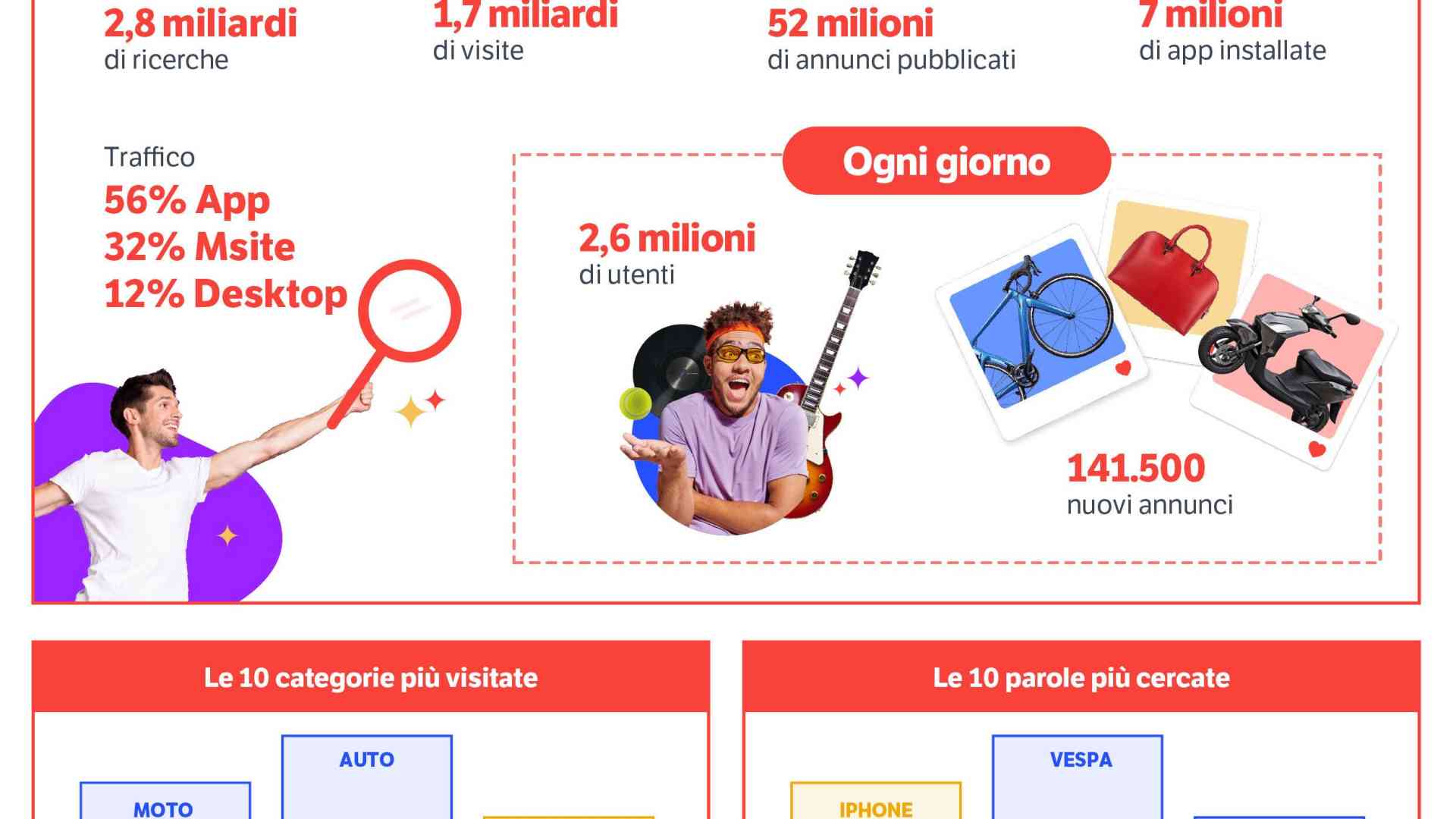 Per il terzo anno consecutivo, la piattaforma registra una crescita importante sui principali indicatori. Non solo fatturato ed Ebitda, ma anche le metriche specifiche: nel 2024 sono state effettuate 2,8 miliardi di ricerche (+4,3% sul 2023); oltre 1,7 miliardi di visite (+5,5%) provenienti per la gran parte da mobile (88%), app compresa, di cui nel 2024 sono stati effettuati oltre sette milioni di download. Ogni giorno su Subito sono stati in media 2,6 milioni gli utenti attivi (in crescita del +5,7% vs 2023); la loro attività ha portato ad un totale di circa 52 milioni di annunci pubblicati in piattaforma, di cui circa 141.500 nuovi ogni giorno, che fanno di Subito il luogo perfetto in cui trovare tutto ciò che si cerca, dalle piccole necessità quotidiane alle grandi scelte della vita, come l’auto o la casa.