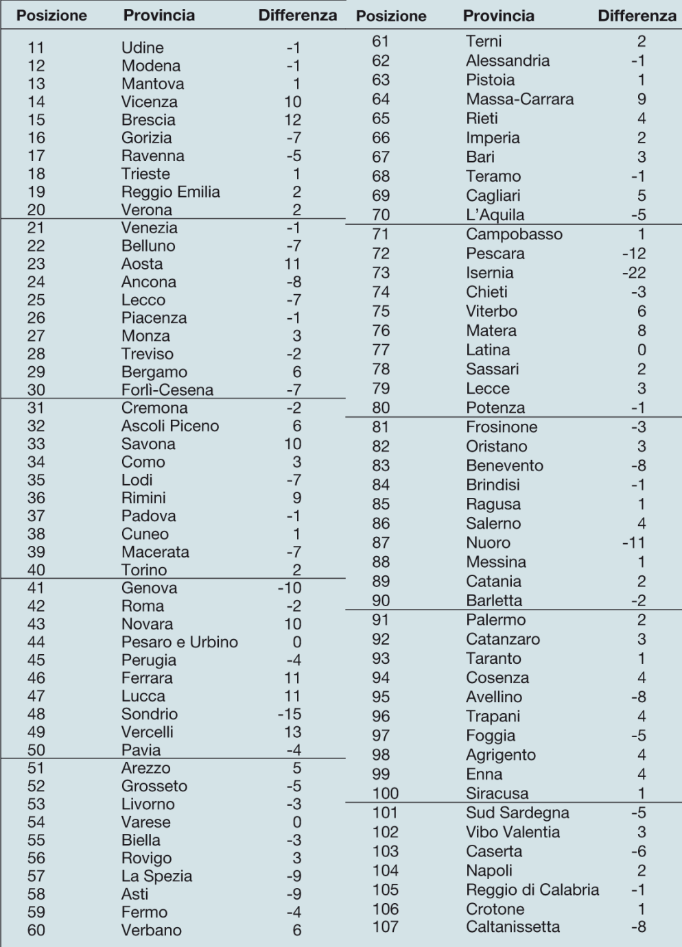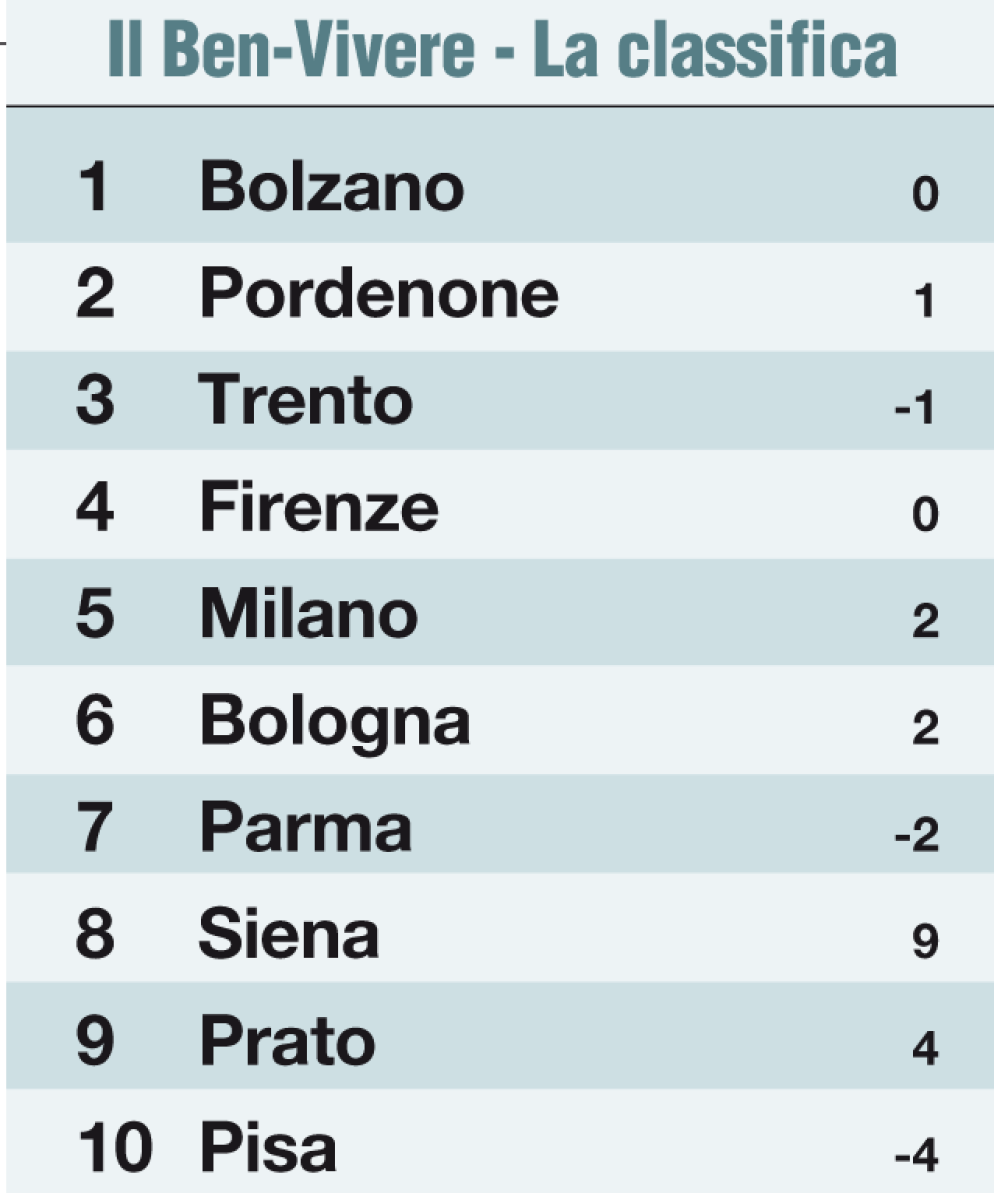 La vetta della classifica resta saldamente in mano al triangolo del Nordest con Bolzano che si conferma prima e Pordenone seconda che sorpassa di misura Trento. Resta al quarto posto Firenze – prima provincia di una Regione non a statuto speciale – risalgono rispettivamente al quinto e al sesto Milano e Bologna, seguite dal gruppo di testa delle province di medie dimensioni: Parma settima, Siena ottava che guadagna ben 9 posizioni rispetto allo scorso anno, infine Prato e Pisa a chiudere la top 10.
