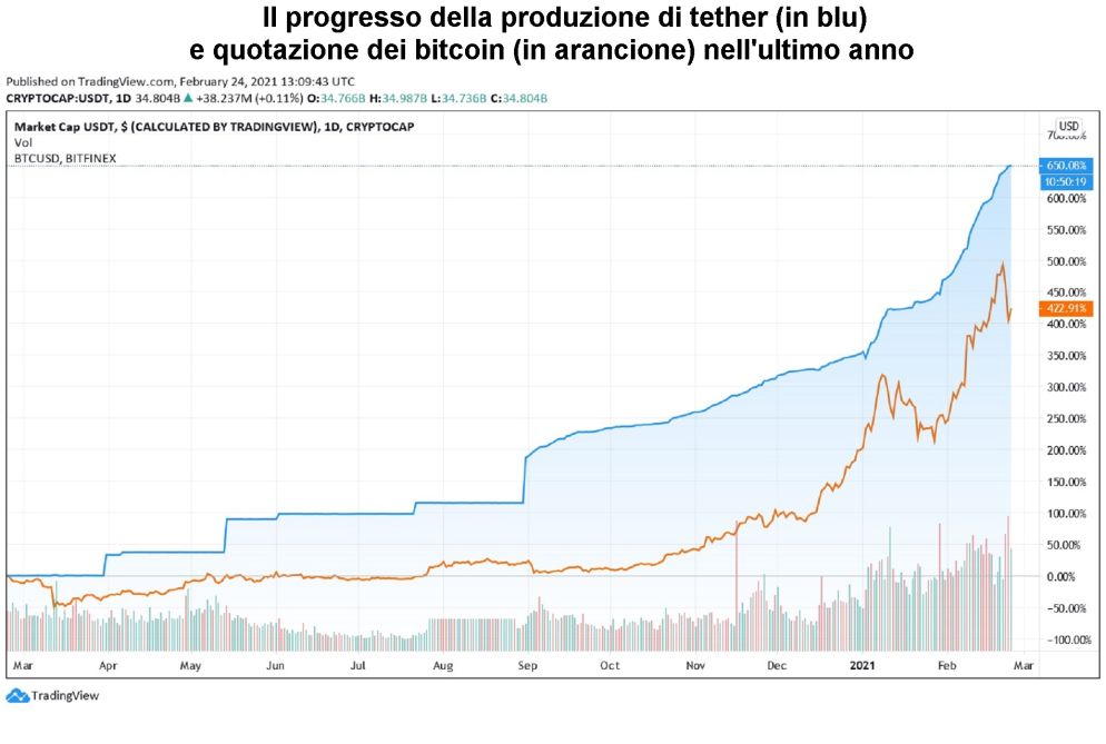 Raramente chi compra bitcoin lo fa utilizzando moneta fiat, cioè denaro legale garantito dallo Stato che la emette. La moneta più utilizzata per acquistare bitcoin è invece il tether, il cui valore è fissato al dollaro perché la società che lo emette garantisce di avere messo a riserva un dollaro, o un titolo equivalente, per ogni tether che ha messo in circolazione. Da tempo diversi osservatori hanno notato come ogni fase di accelerazione del prezzo dei bitcoin sia anticipata da un significativo aumento dei tether prodotti.