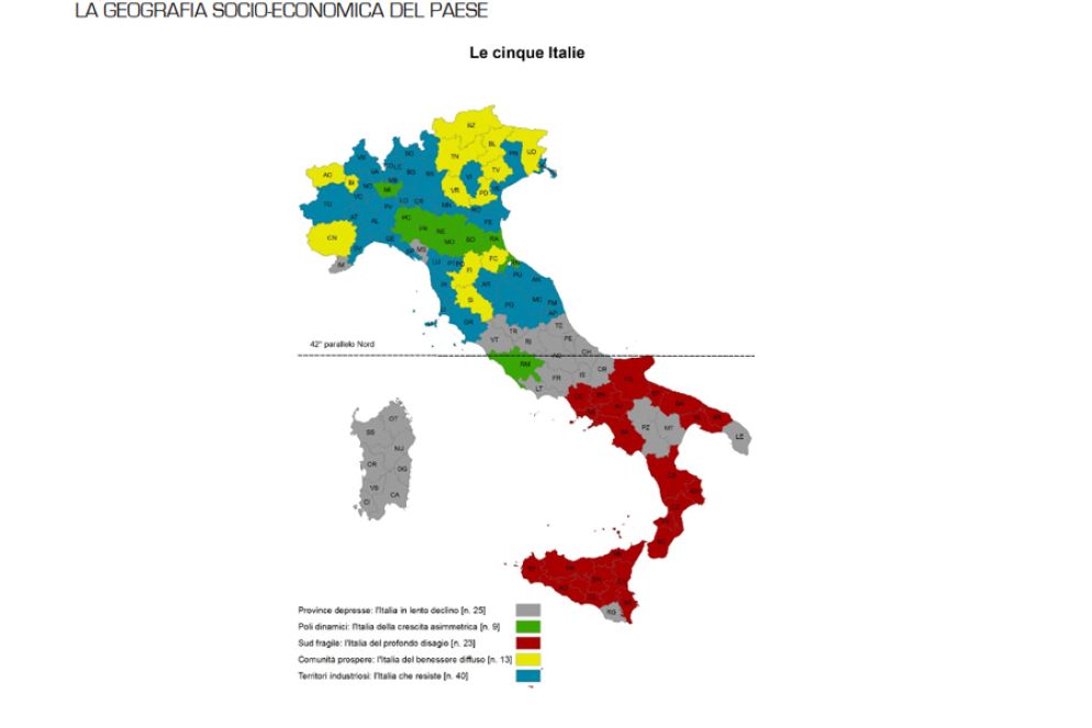 Nel quarto gruppo ci sono le «Province depresse», l’«Italia in lento declino». Ne fanno parte Sardegna, Basilicata, le provincie di Lecce e Ragusa e, risalendo verso nord, Molise e Abruzzo, tutto il Lazio tranne Roma, Terni, Massa Carrara e Imperia. Territori impantanati in una lunga stagnazione ma ancora non troppo distanti dagli standard nazionali. Il Pil è a quota 18.500 euro, l’occupazione oltre il 51%. Ben diversa la situazione dell’ultimo gruppo, il «Sud fragile» dove il Pil pro capite è di circa un terzo sotto a quello nazionale e meno della metà di quello del primo gruppo, l’indice di occupazione è al 40%, e la disoccupazione giovanile oltre il 55%, il saldo migratorio in rosso. Un’«Italia del profondo disagio» che, afferma il rapporto «non ha ancora dato cenni di reazione alla crisi». Stanno quasi tutte in questa area le 23 province italiane dove le diseguaglianze non sono aumentate durante la crisi. Una sorta di livellamento verso il basso.