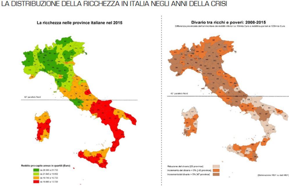 La lunga recessione ha spezzato ancor più lo Stivale. Ma il dualismo economico Nord-Sud che da un secolo e mezzo disunisce ciò che l’Italia ha unito non basta più a descrivere quale Paese siamo oggi. L’effetto combinato tra la crisi (specialmente dell’industria) e la spinta alla modernizzazione ha prodotto nuove fratture che percorrono trasversalmente le dorsali italiane. Oggi il Paese può essere suddiviso in cinque aree diverse. La nuova mappa delle diseguaglianze emerge da una ricerca delle Acli, condotta rielaborando i dati delle dichiarazione dei redditi ai presentate ai Caf e quelli delle banche dati ufficiali. Sono le «Cinque Italie» che ci lascia in eredità la crisi, aree non sempre contigue ma omogenee al loro interno per il reddito pro-capite, gli indicatori economici e del disagio sociale.