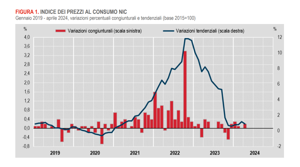 Segnali positivi anche per l’inflazione che è ormai sotto l’1% in Italia e non dovrebbe discostarsi molto da questo valore anche nella media dell’intero 2024. Nello specifico, ad aprile, secondo le stime preliminari dell'Istat, l’inflazione torna a scendere, portandosi a 0,9%.