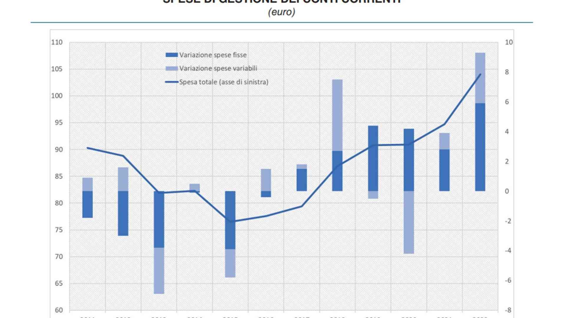 Il rincaro per gestione dei conti correnti registrato nel 2022 è il settimo consecutivo. Dal 2011 al 2022 la variazione delle spese fisse ha contribuito in modo preponderante alla dinamica delle spese di gestione, sia nel corso delle fasi espansive sia in quelle di contrazione della spesa; in particolare, prendendo in esame la fase espansiva, iniziata nel 2016 e tuttora in corso, la somma degli incrementi di spesa ammonta a 27,5 euro, dei quali 21,1 riconducibili alle spese fisse.