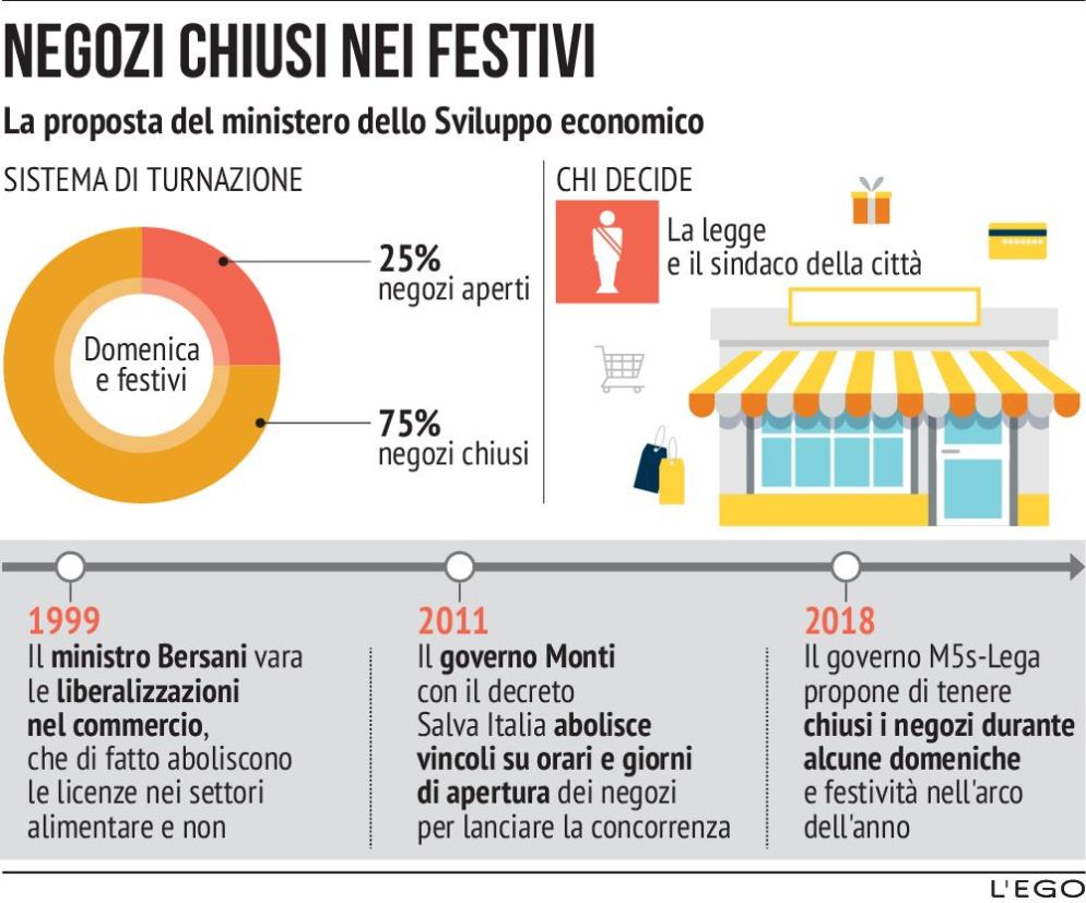 L’intenzione sia del M5s che della Lega è quella di escludere dal meccanismo di turnover nelle chiusure le città d’arte e le località turistiche, come precisato dal ministro Gian Marco Centinaio. Nel frattempo, Cna Turismo e Commercio chiede al governo «di confrontarsi al più presto con le organizzazioni del settore sulla delicata materia delle aperture domenicali» e sottolinea la necessità di tener conto nell’eventuale riforma «delle esigenze delle micro e piccole imprese che nel tempo si sono adeguate alla normativa e hanno investito massicciamente per offrire ai consumatori uno shopping festivo di qualità nelle località turistiche, nei borghi, nei centri urbani pedonalizzati, nei centri commerciali naturali, nelle periferie cittadine, trasformandosi in vero e proprio presidio sociale». Realtà che svolgono un’opera preziosa e all’esecutivo gialloverde si chiede di tenerne conto.