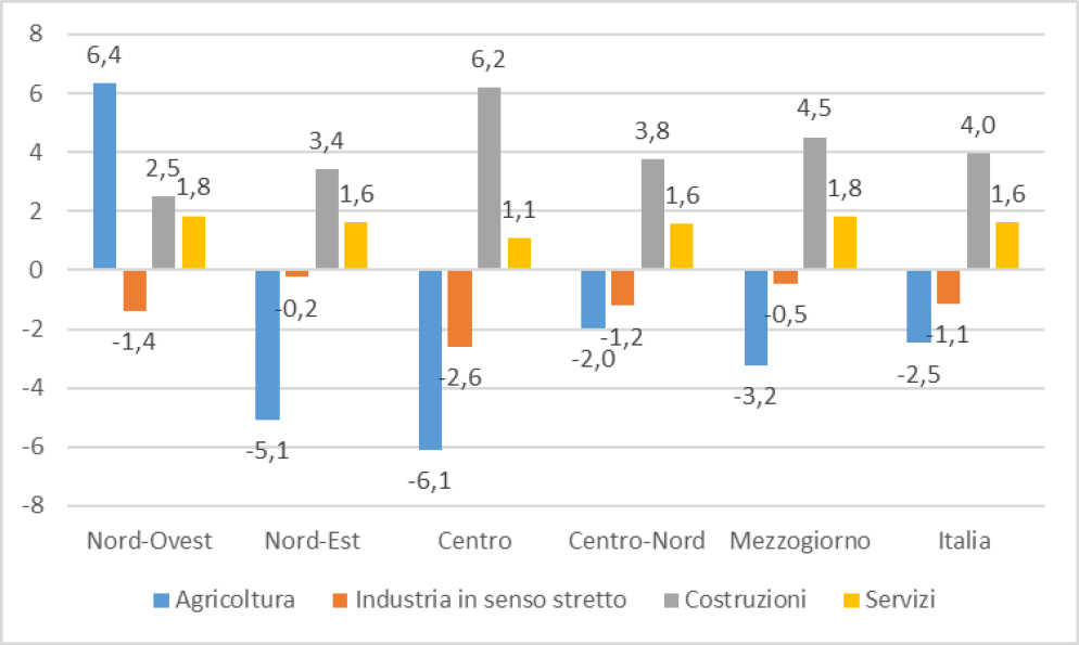 La crescita più accentuata del PIL meridionale è stata sostenuta soprattutto dalle costruzioni (+4,5%, quasi un punto percentuale in più della media del Centro-Nord), a fronte di una più contenuta contrazione del comparto industriale (-0,5%) e di una crescita dei servizi dell’1,8%.