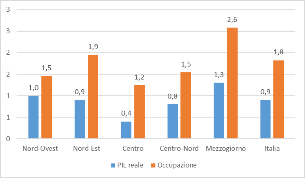 Del totale di 1.946 miliardi di euro di Pil prodotto in Italia, 1.101 miliardi di euro vengono prodotti al Nord, mentre 410 miliardi di euro è il valore del Pil prodotto nel Centro Italia e infine nel Mezzogiorno si calcola siano stati prodotti 430 miliardi di euro di Pil.